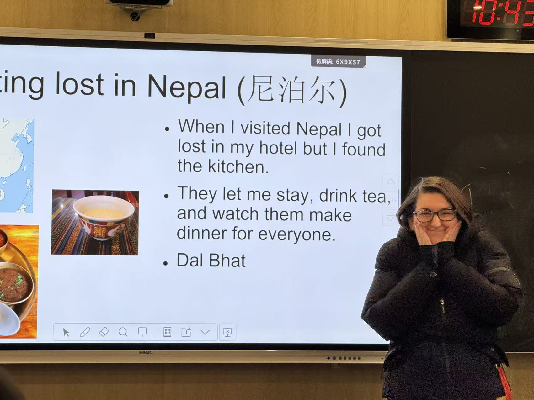 随后,王哲仁老师播放了经典电影《白日梦想家》中的精彩片段,以影片中承载人生意义的“25号底片”为隐喻,启发同学们:“每个人的生活中都有专属的‘25号底片’,那些难忘的旅行瞬间正是最珍贵的记忆印记。” 外教Lauryn率先分享,通过展示与家人的旅行合影,讲述了自己游历世界却始终心系家庭的温情故事,让同学们感受到“旅行与亲情”的深层联结;王哲仁老师则晒出同一景点的两次旅行照片,对比不同人生阶段的心境变化,鼓励大家“挣脱书本桎梏,用脚步丈量山河,在实地体验中收获成长”。