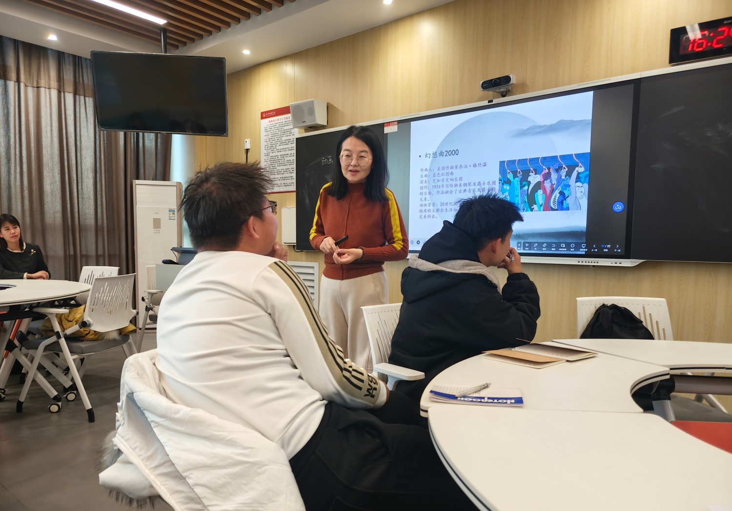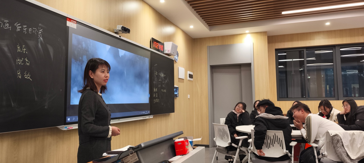 2025年12月8日,远景学院杨丽佩老师的《影视音乐与表达》的课堂,邀请到艺术传媒学院的郭妮丽老师,一起开展了音乐与动画的跨学科的对谈,课程基于动画音乐的类型、作用和案例,进行作品的赏析和解读,为同学们展示动画音乐的意义和美学价值。