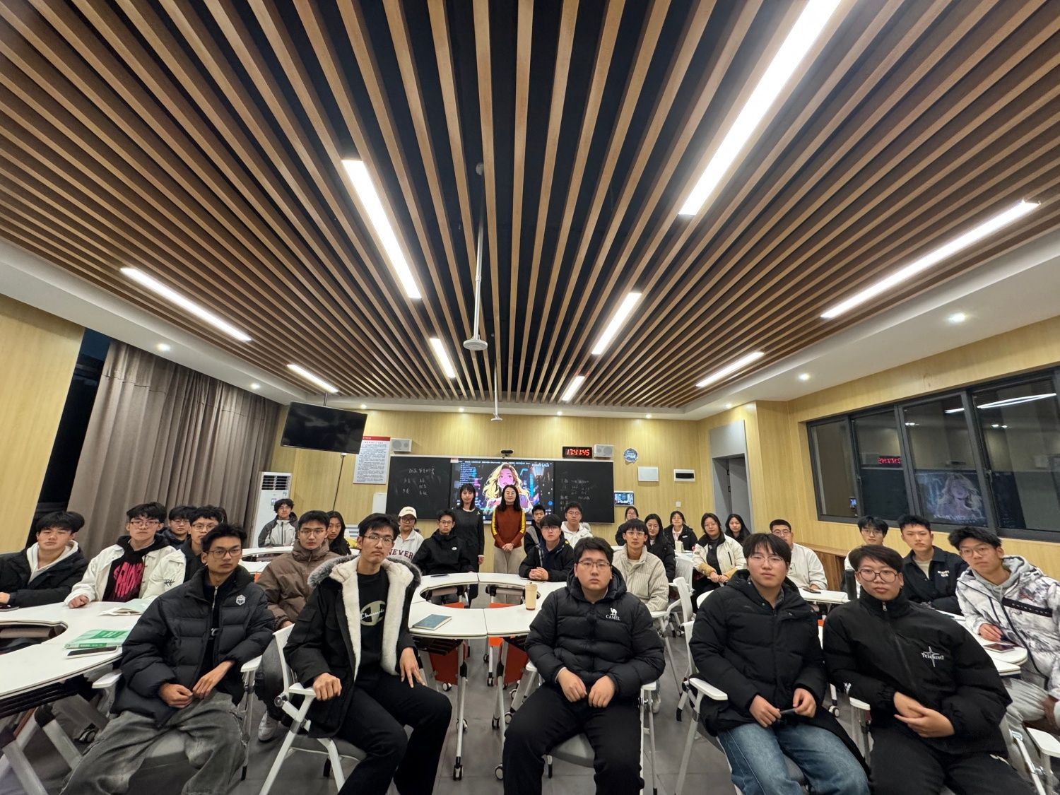 杨老师讲到剧场版动画配乐,剧场版动画音乐丰富、演奏规模大,规格高等,并给同学们欣赏了《2000幻想曲》,交响乐、钢琴等纯音乐,当赋予了故事和画面,就会变得更加的生动易懂。杨老师还讲到TV动画的音乐特点,例如传唱度高,成人化和低龄化并存等特点。杨老师与同们交流互动,那些依然环绕在耳边的动画歌曲,有些动画的故事同学们不一定记得,但是熟悉的旋律却记忆深刻。