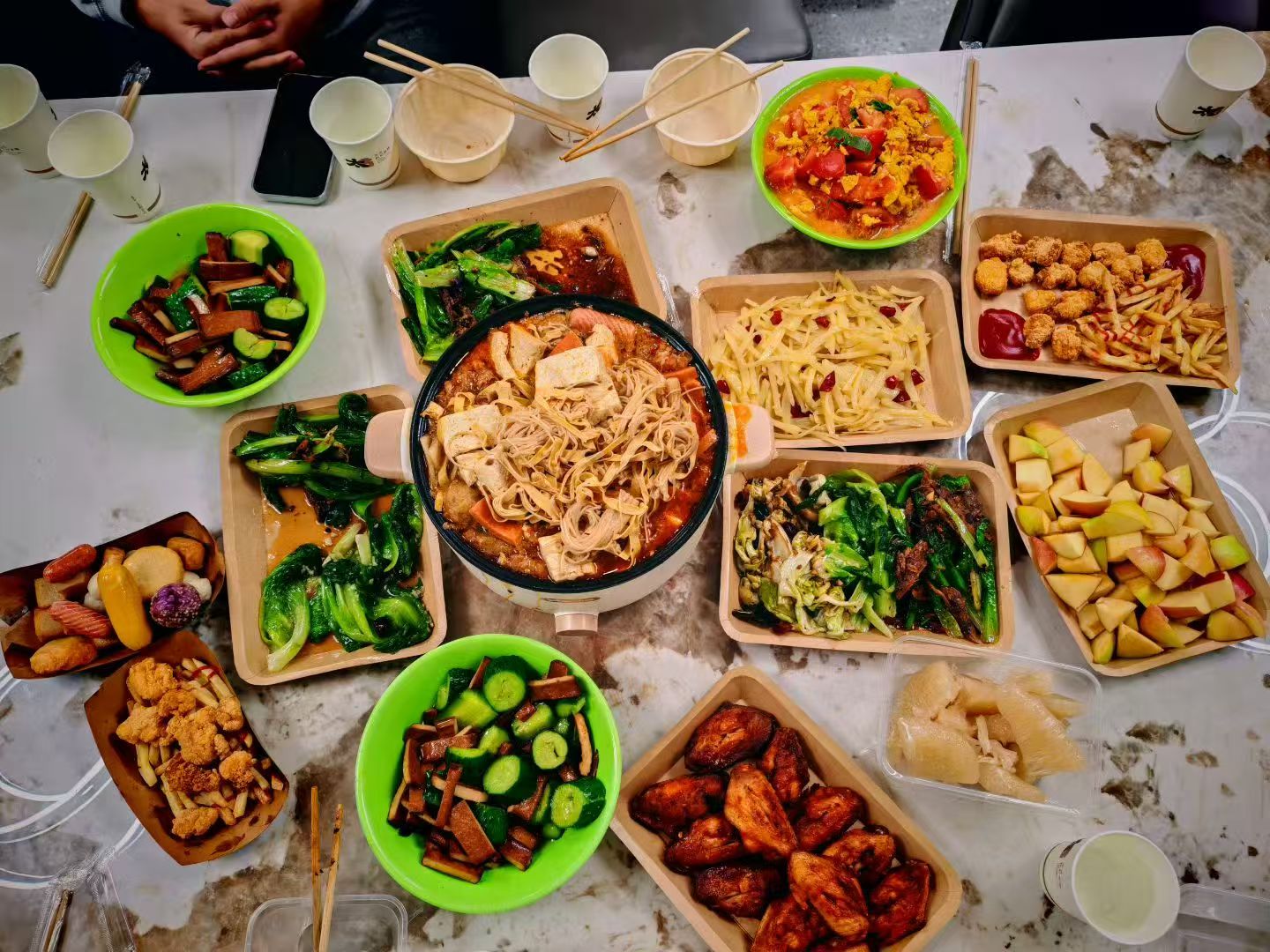 在超市购买到食材后,师生们迅速投入准备工作。洗菜、切配、调味、烹炒……导师与同学们一起,在灶台前默契配合。刘建国和宋卓童手法娴熟,主动承担起“大厨”角色,刘湘和李萌溪主动认领洗菜备菜的任务,张波和王伟豪则为同学们准备火锅食材,张渊宇为同学们准备了鸡米花和薯条;段老师则在一旁细心指导,分享烹饪技巧。厨房里不时传来欢声笑语,锅铲与炒锅的碰撞声、食材下锅的滋滋声,交织成一曲温馨的生活协奏。在共同准备晚餐的过程中,师生之间的界限渐渐模糊,取而代之的是如家人般的协作与信任。大家分工明确,互相学习,从挑选食材到精心烹制,每一个环节都凝聚着团队的智慧与热情。