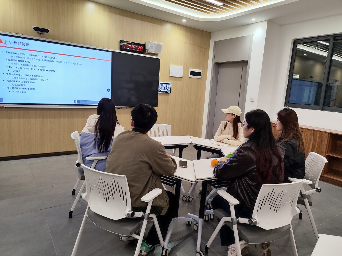 活动伊始,许老师化身“信息导航员”,为大家倾情分享。她从考研、考公、考编的基本概念聊起,细致解读了备考时间线、关键政策与选择策略,还用生动的往年实例,帮同学们在纷繁的信息中理清了头绪,仿佛送来了一幅清晰的“前行地图”。
