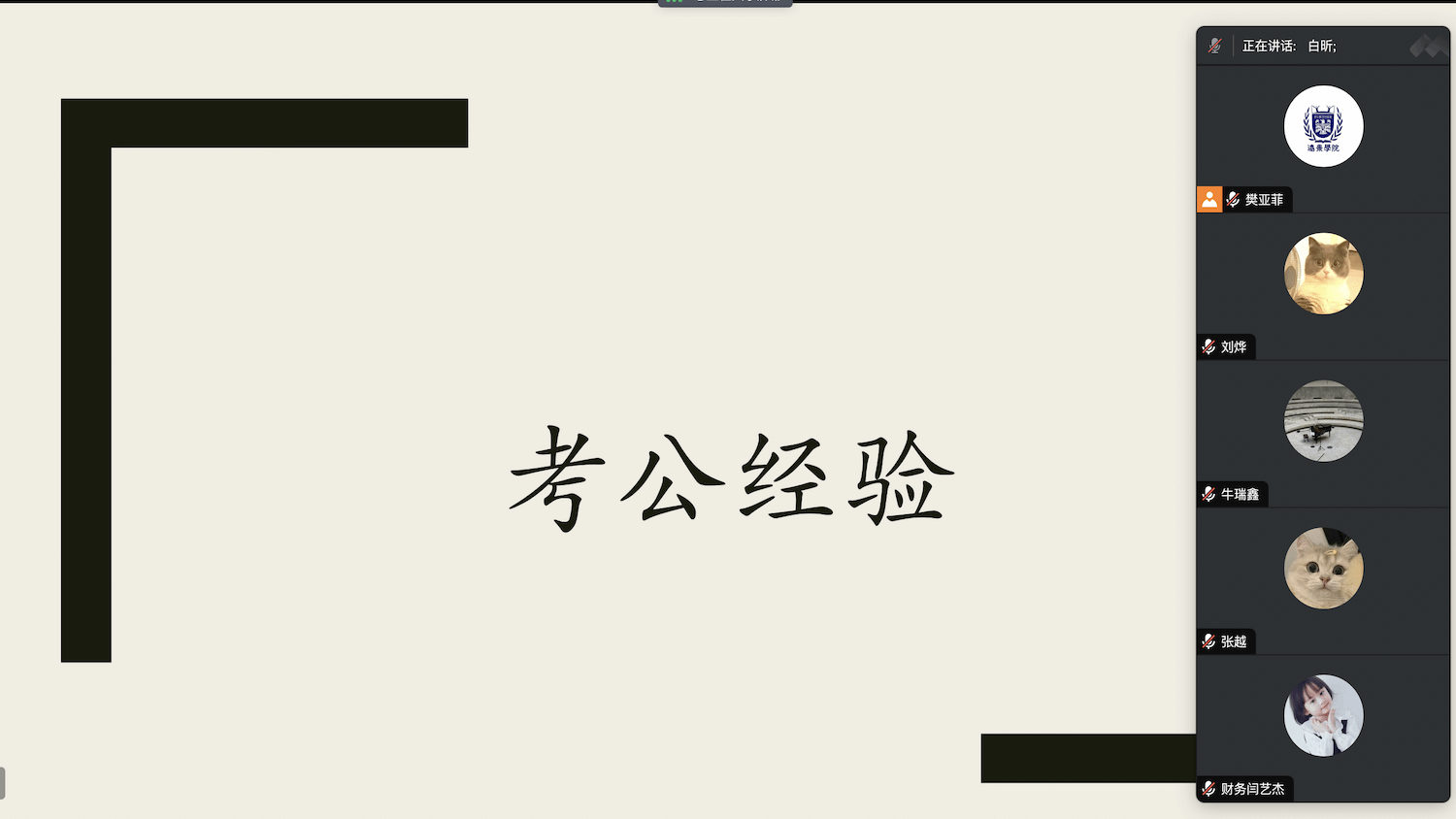 毕业季将至,为帮助应届毕业生破解考研、考公、求职路上的困惑,明晰发展方向,近日,远景学院导师牵头组织了一场主题鲜明的线上经验分享会。分享会通过腾讯会议形式举办,特邀三位优秀职场人——考研成功上岸的学姐、顺利考取公务员的学长及汽车行业大厂从业者,分别围绕“考研心态调整”“考公做题秘诀”“企业应聘简历写作”三大核心议题,倾囊相授实战经验,为樊亚菲导师组的毕业生送上了一份“干货满满的成长指南”。