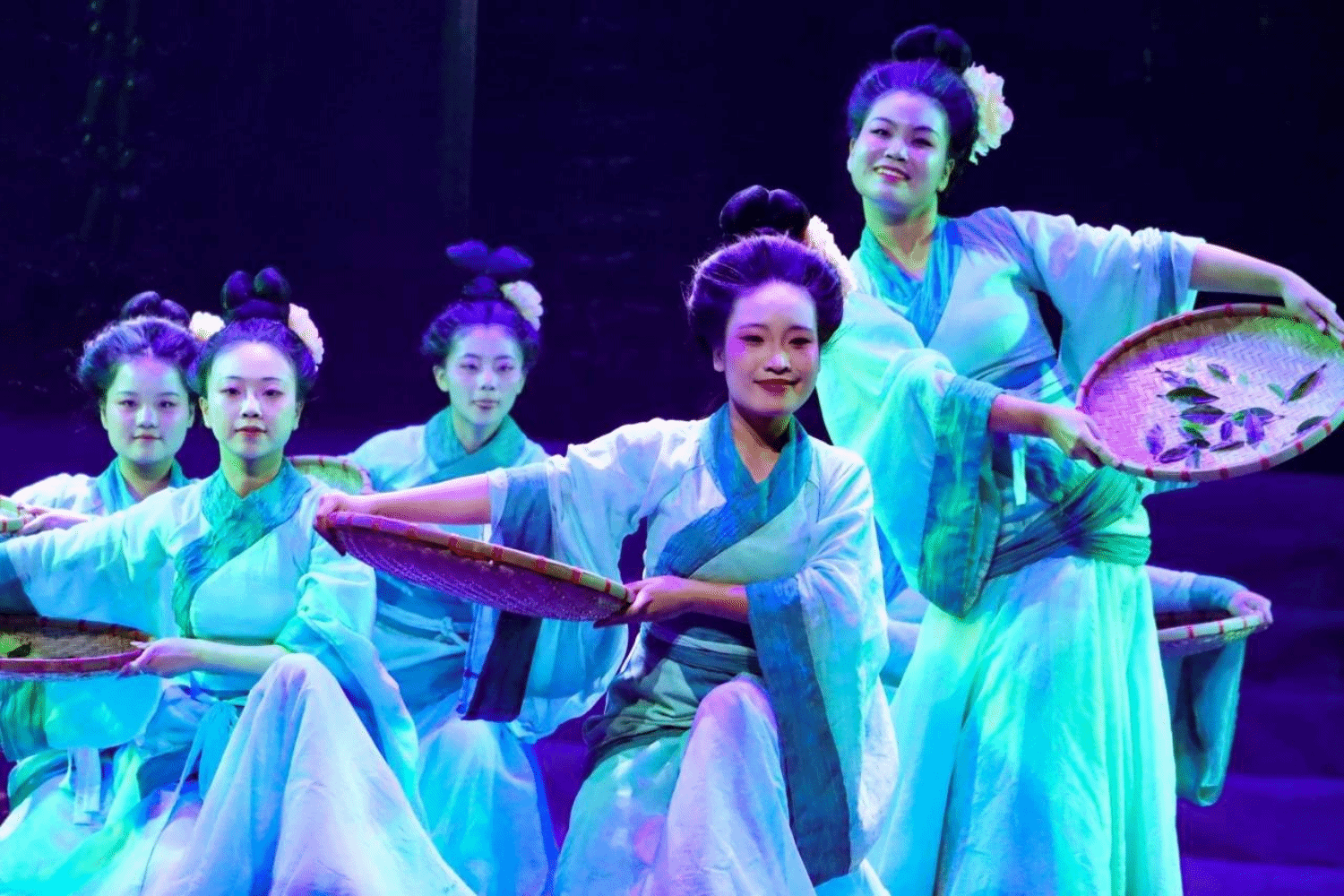 《琵琶行》演绎了白居易从仕途的得意到被贬后发生的种种事情,通过巜序》,《上朝》,《灯笼》,巜觐见》,《采茶》,《饮酒作诗》,《仙女》,《水墨》,《苦思》等一系列节目,无声地演绎了白居易的一生,舞台设计打破传统束缚,以极简美学构建出流动的时空场域。幕布上投影着水墨风格的江州江景,斑驳的光影在木质屏风间流转,与散落舞台的蒲团、酒坛共同勾勒出诗意空间。舞台中央悬挂的水墨屏风随剧情流转切换画面,时而晕染出江州瑟瑟的秋景,时而浮现出商船夜泊的剪影,配合若隐若现的纱幔与零星点缀的灯笼,营造出“别时茫茫江浸月”的朦胧意境。