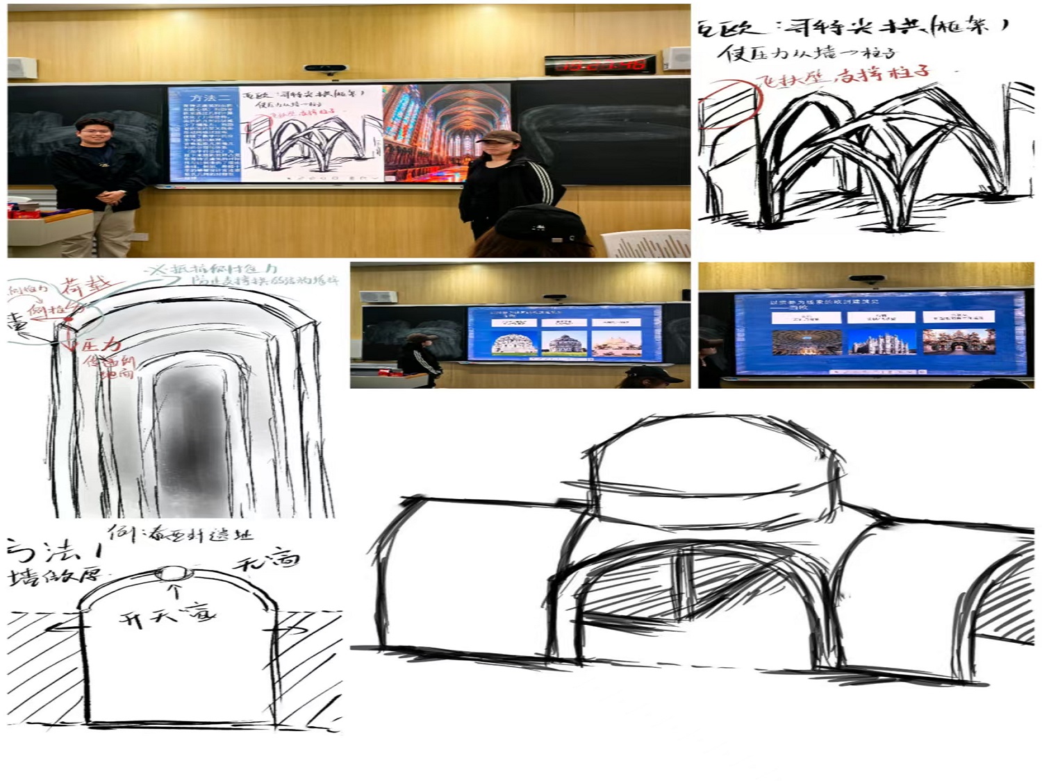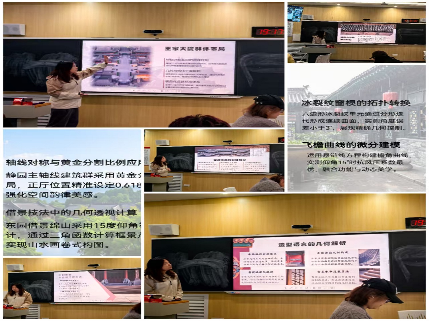 京派四合院小组发现,看似规整的院落布局暗含“模数化”智慧:以明间面阔为基本单位,通过等比缩放构建空间秩序,既保证采光通风,又形成韵律美感。晋派窑洞组则揭秘穹隆顶的几何奥秘——正十二边形近似圆周的巧妙设计,使穹顶在缺乏钢筋的时代仍能完美分散压力。而徽派小组的突破性发现更为精妙:他们通过解析天井空间与建筑主体的比例关系,揭示了徽派建筑中隐含的“黄金分割”密码——以天井开口宽度与厅堂进深之比为1:1.618的黄金比例构建空间张力场,既实现了“四水归堂”的雨水导流功能,又通过光影在一天中的渐变投射,在青砖白墙间演绎出动态的几何光影诗学。更令人惊叹的是,马头墙层叠的曲线轮廓竟暗合《周髀算经》中“七衡六间”的日月运行轨迹模型,使防火隔断功能与天人合一的宇宙观达成精妙共振。中欧建筑对比研究引发深度思考。东欧小组在圣瓦西里大教堂的“洋葱顶”中,解析出双曲几何的离散美;西欧组则通过巴黎圣母院飞扶壁的力学建模,直观呈现三角形支撑体系的稳定性。而最精彩的跨界碰撞发生在结题汇报:当苏派园林组用拓扑学解读“移步换景”的造景哲学,当川派民居组通过分形几何揭示穿斗式构架的抗震玄机,那些曾尘封于《九章算术》的公式定理,突然在青砖黛瓦间焕发出新的生命。