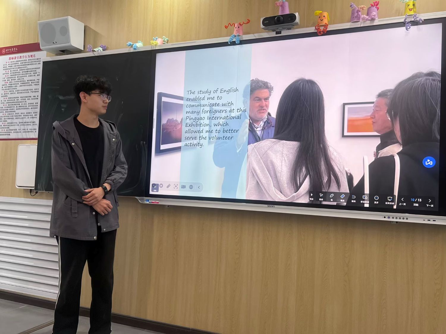 在英语分享课堂上,同学们用英语讲述着各自的志愿服务故事。有的同学负责外国摄影师的接待引导,从行程沟通,到展区内的作品介绍,用英语搭建起沟通的桥梁;有的同学参与国际展区的服务工作,协助解决外国嘉宾在观展、交流中的语言问题,成为中外文化交流的“小小纽带”;还有的同学负责展会现场的咨询服务,用英语耐心解答海外游客关于展区分布、活动安排的疑问,展现出良好的跨文化素养。