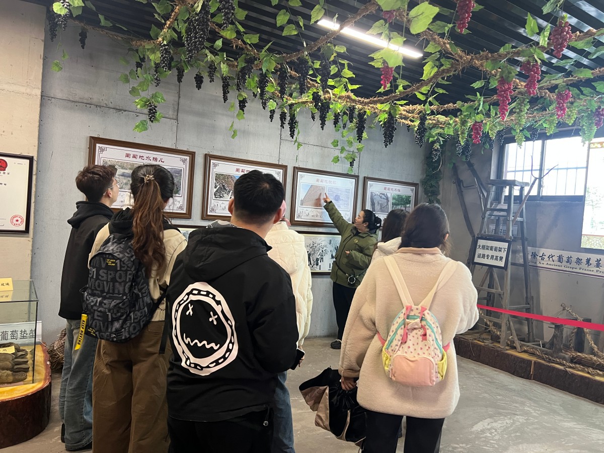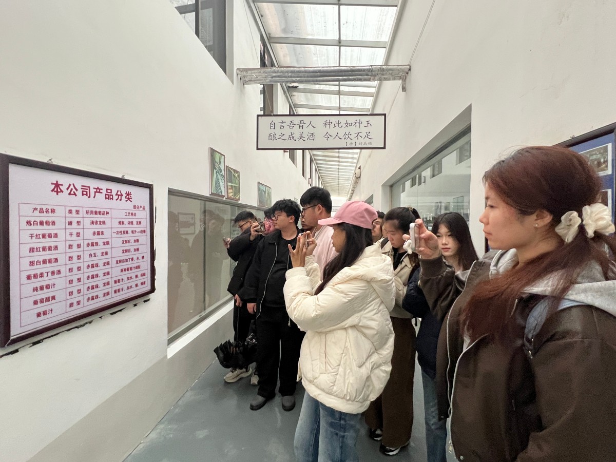 抵达清徐葡萄酒厂后,同学们依次参观了生产车间、葡萄酒博物馆和产品展区。在生产车间,半自动化灌装线与传统工艺的结合赋予葡萄酒独特风味;博物馆中,从古代葡萄种植到现代品牌发展史,清徐葡萄产业的千年文脉徐徐展开;展区内,琳琅满目的葡萄酒产品则展现了企业从原料优势到商品转化的成果。“把别处的好葡萄,攀上清徐的葡萄架,是最实在的资源互补”胡梦菲同学写道,“这趟旅程,让我真切感受到传统工艺与现代技术的融合”耿雅君同学不由感慨。