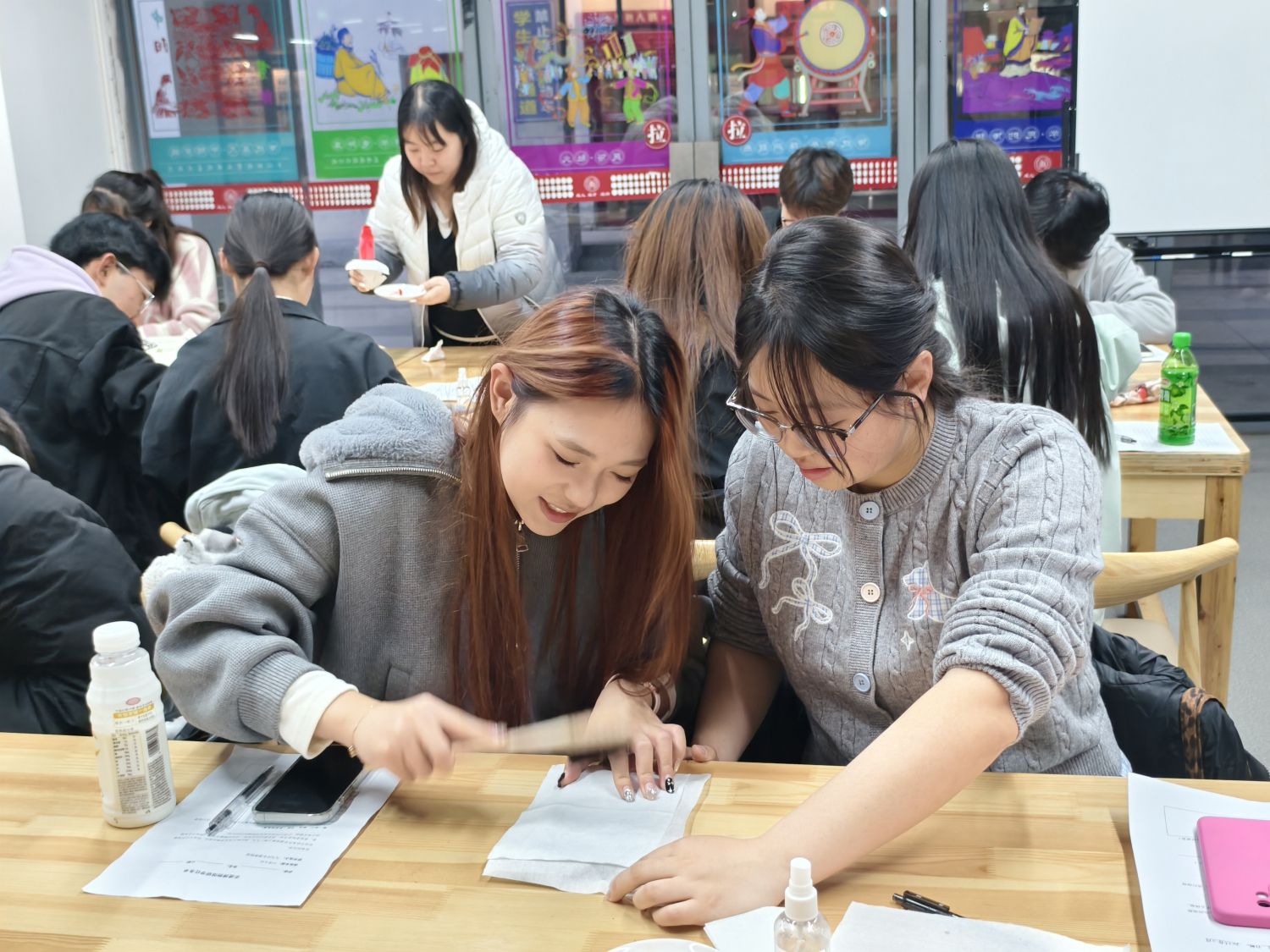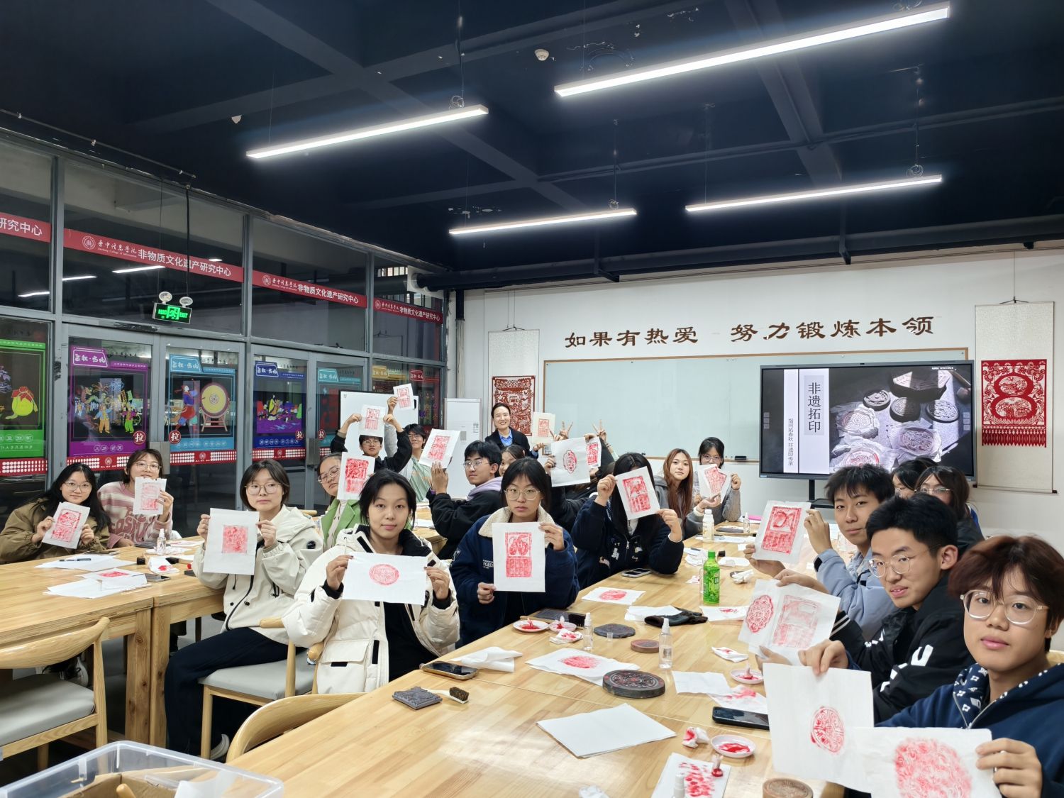 在非遗研究中心老师的专业指导下,同学们亲身体验了拓印这一古老的技艺。从清理石板、铺宣纸、喷水润湿,到用拓包均匀着墨,每一个步骤都需耐心与巧思。当古老的纹样或文字清晰地呈现在宣纸上时,同学们在成功的喜悦中,真切感受到了传统技艺的精妙与非遗传习的不易,对“匠人精神”有了更具象的认知。