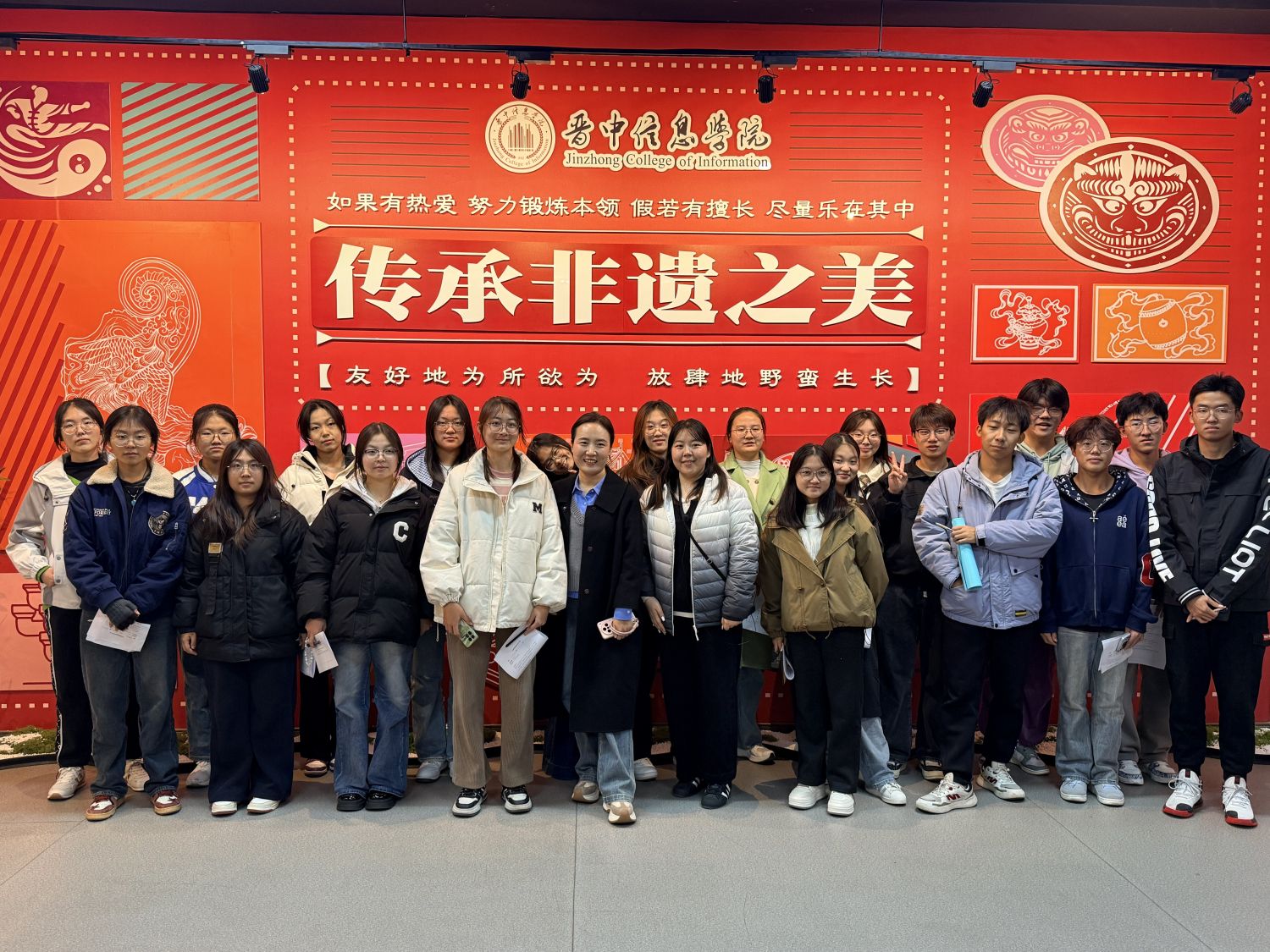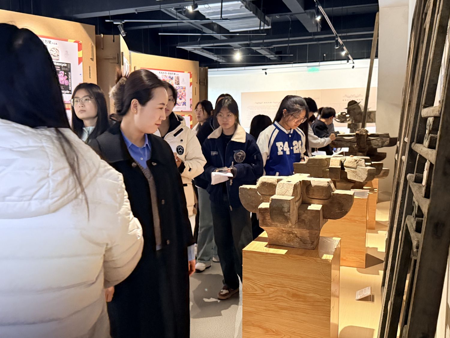 活动伊始,主讲教师王慧敏为同学们介绍了本次研学活动的目的,明确了本节课的学习任务,并带领大家回顾了课程所学晋派建筑的特点。同学们跟随博物馆的陈列脉络,漫步于承载着历史印记的文物与艺术品之间。从古朴的晋派三雕到晋中非遗的活态传承,从地方民俗器物到信院学子的艺术再创作,每一件展品都成为同历史文化无声对话的媒介。同学们凝神观察,低声交流,在实物与文献的印证中,加深了对书本中抽象文化概念的具体理解。