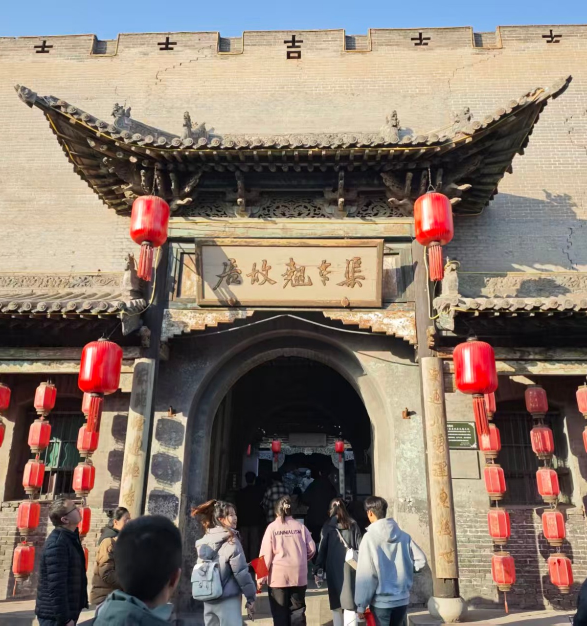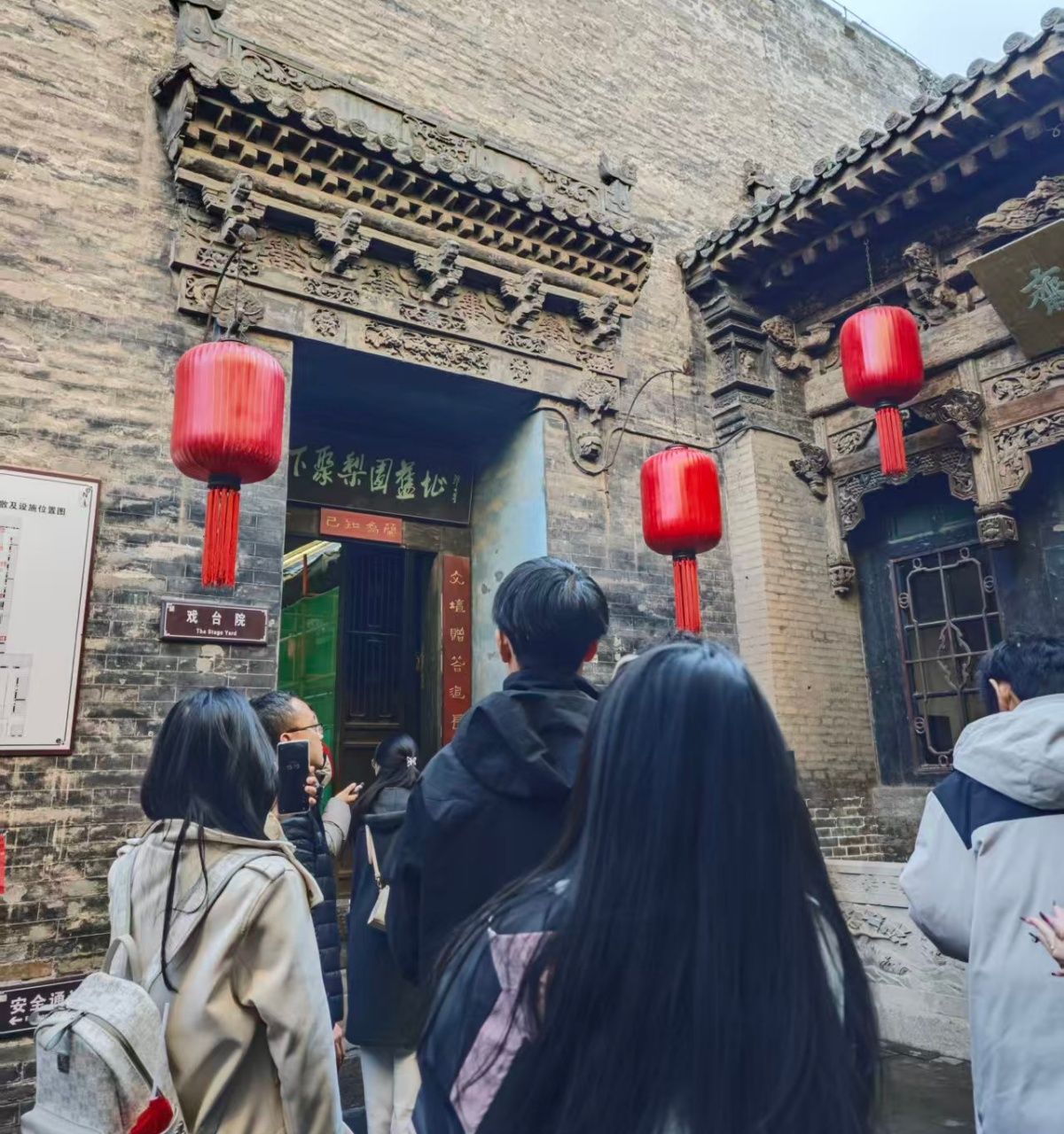 在“五进式穿堂院”中,同学们通过观察石雕栏杆院的“岁寒三友”、戏台院藻井的“八仙过海”彩绘、牌楼院的“福禄寿”砖雕等建筑细节,不仅领略了晋商民居的营造智慧,更从中读出了“修身齐家”的文化内涵。张亚杰老师现场讲解道:“这里不仅是院子,更是一部立体的晋商文化教科书渠家大院的建筑,既有北方的雄浑,又有南方的精巧,更难得的是,它将儒商文化融入一砖一瓦。”
