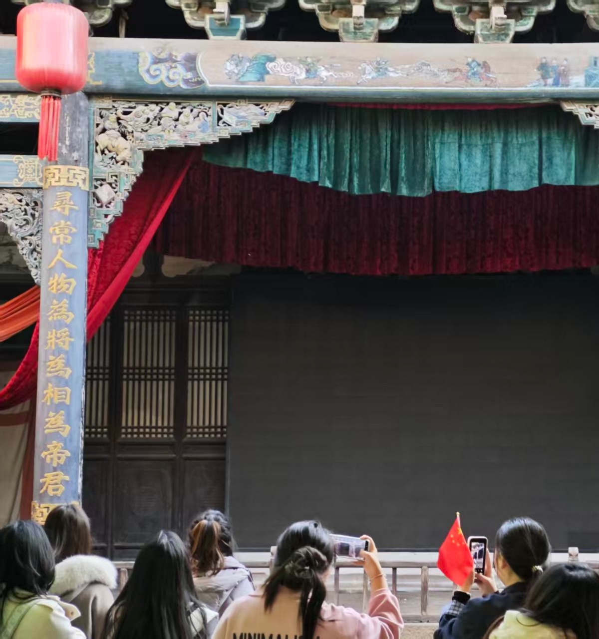 在聚梨园戏班旧址,师生共同探讨了该戏班对晋剧艺术的里程碑贡献。通过戏台两侧“些小戏台可家可国可天下”、“借故喻今教化众生知伦理”等楹联的解读,同学们深刻体会到戏剧在传统社会中的教化功能与文化承载作用。