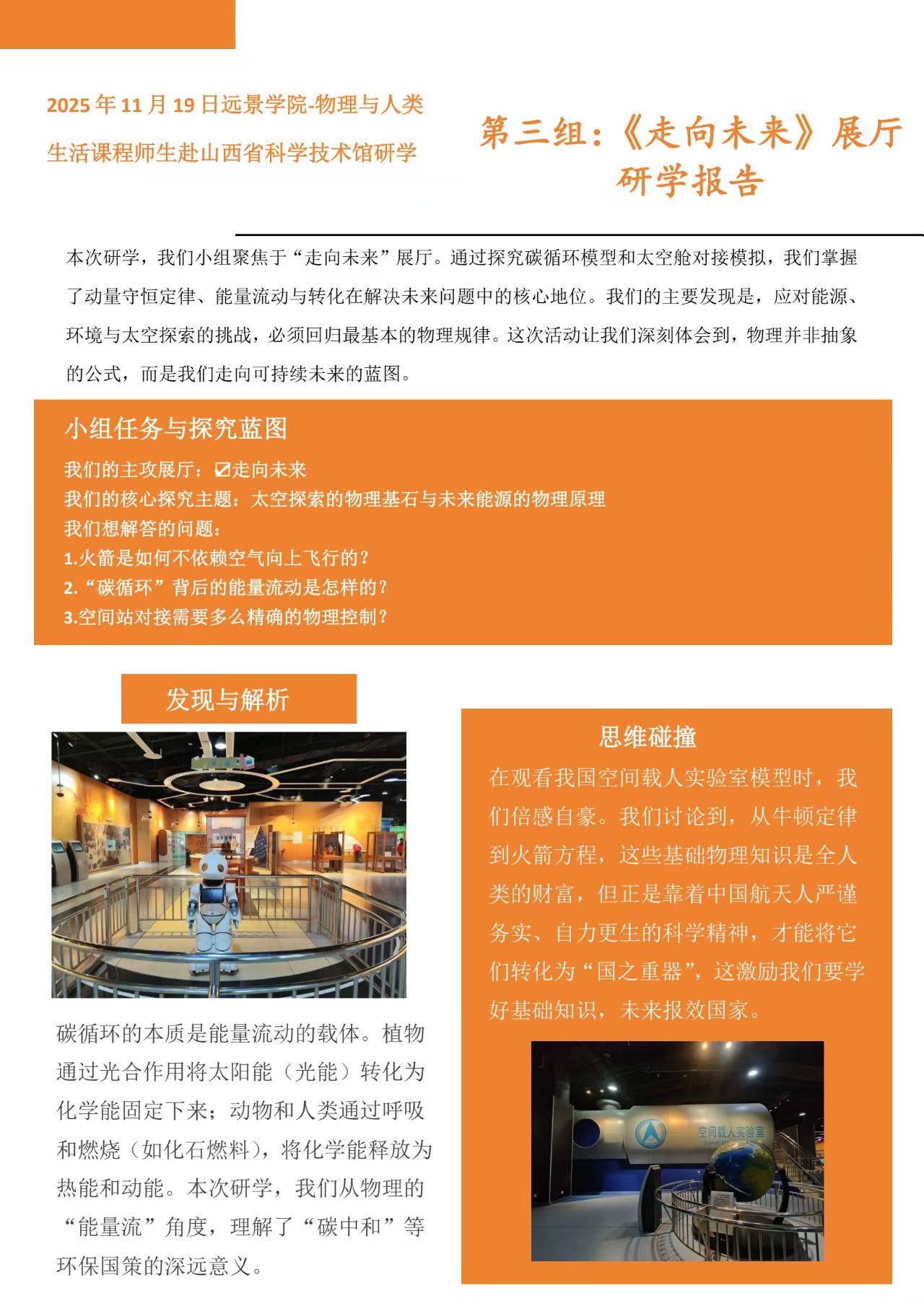 本次山西省科学技术馆研学,是远景学院《物理与人类生活》通识课程践行“知行合一”教学理念的生动体现。它突破了传统课堂的边界,让同学们在沉浸式的科技环境中,通过观察、操作与思辨,实现了从物理知识的被动接受者到主动探索者与未来思考者的角色转变,为培养具备科学素养与创新思维的综合型人才提供了宝贵的实践平台。