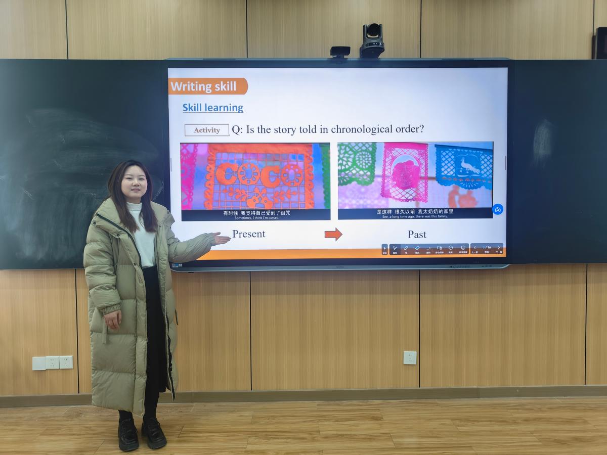 紧接着,李静芳老师李静芳老师讲解了倒叙(flashback)写作技巧,从寻梦环游记电影开头导入,引出什么是flashback,随后用泰坦尼克、百年孤独为例讲解了倒叙的广泛应用,随后用例子深入分析了倒叙在叙述结构以及人物深刻塑造上的重要作用,最后生动形象讲解了如何使用“trigger”和“transitional words”使得倒叙的时间切换自然过渡,并用描述图片练习巩固倒叙使用技巧。在讲解如何实现倒叙时间切换的自然过渡时,她生动形象地介绍了“trigger”(触发点)和“transitional words”(过渡词)的运用技巧,并通过描述图片练习环节,让学生在实践中巩固所学知识,提高运用能力。整堂课形式丰富多样,包括案例分析、小组讨论、实践操作等;节奏紧凑明快,各个环节衔接自然流畅;内容生动有趣,充分调动了学生的学习积极性和主动性,充分展现了新教师独特的教学思维和创新的教学理念。
