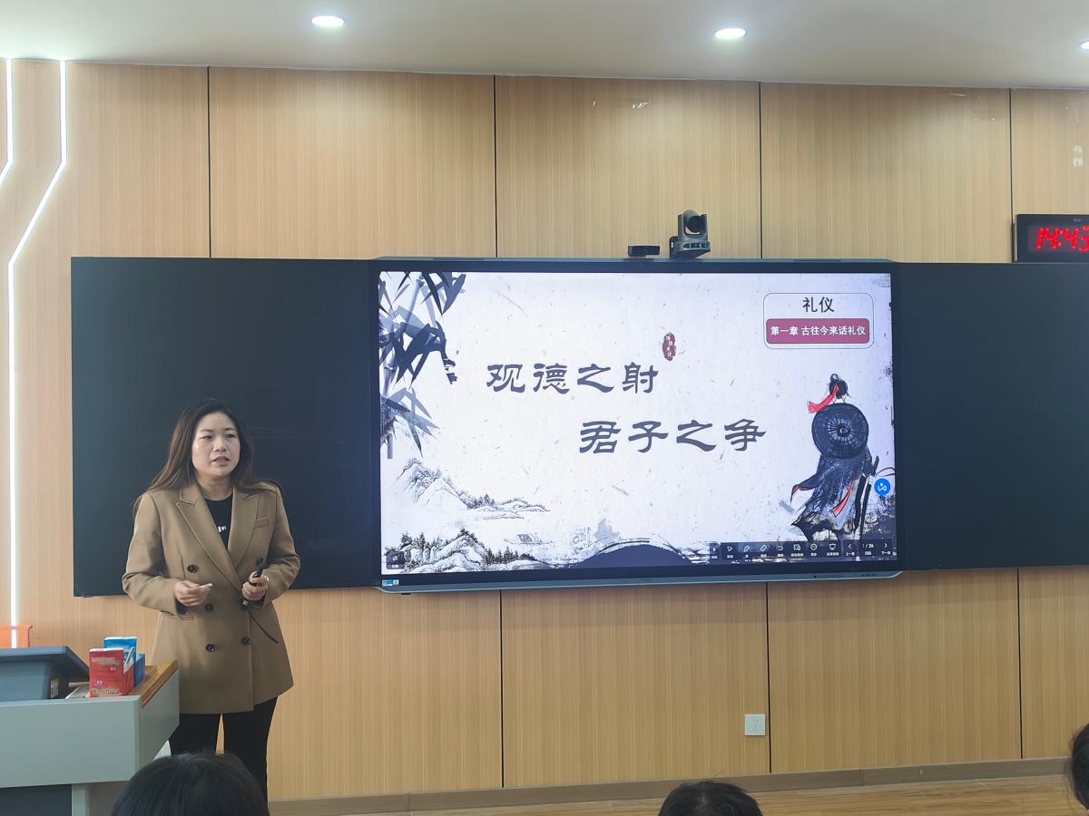 随后进入说课环节,吴晛莉老师以“立德树人、以文化人、以美育人”为主题,详细阐述了礼仪课程的创新实践。从课程介绍、创新理念、创新举措到创新成效,全方位展示了该课程的创新亮点。吴老师的精彩授课,充分展现了优秀教师的专业素养和教学风采,赢得了在场师生的阵阵掌声和一致认可。