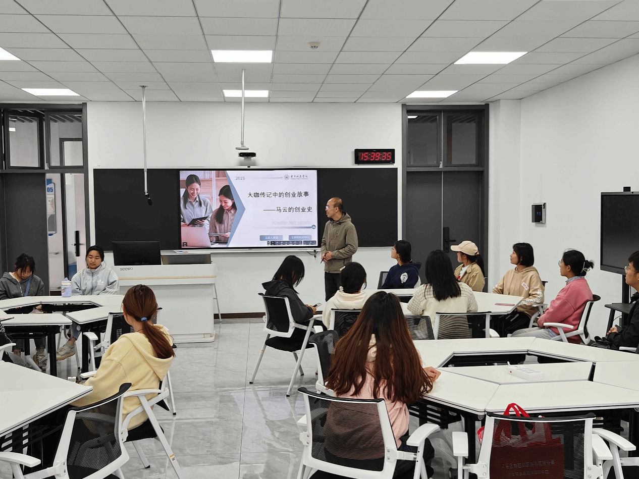活动现场座无虚席,贾俊老师开场便点明,要带大家走进马云跌宕起伏的创业世界。贾俊老师从马云早期创业的艰辛讲起,详细介绍其创办中国黄页时四处碰壁的经历。由于大众对互联网认知有限,马云常遭质疑和拒绝,却始终未曾放弃。为推广中国黄页,他一家家上门拜访企业,这股坚持与执着,同学们感同身受。贾俊老师巧妙结合这些故事与创业理论,深入浅出地剖析创业所需的勇气、坚持和创新思维,强调马云面对无数挫折时坚定信念,才有了改变中国商业格局的阿里巴巴,告诫同学们创业路上不能怕失败。