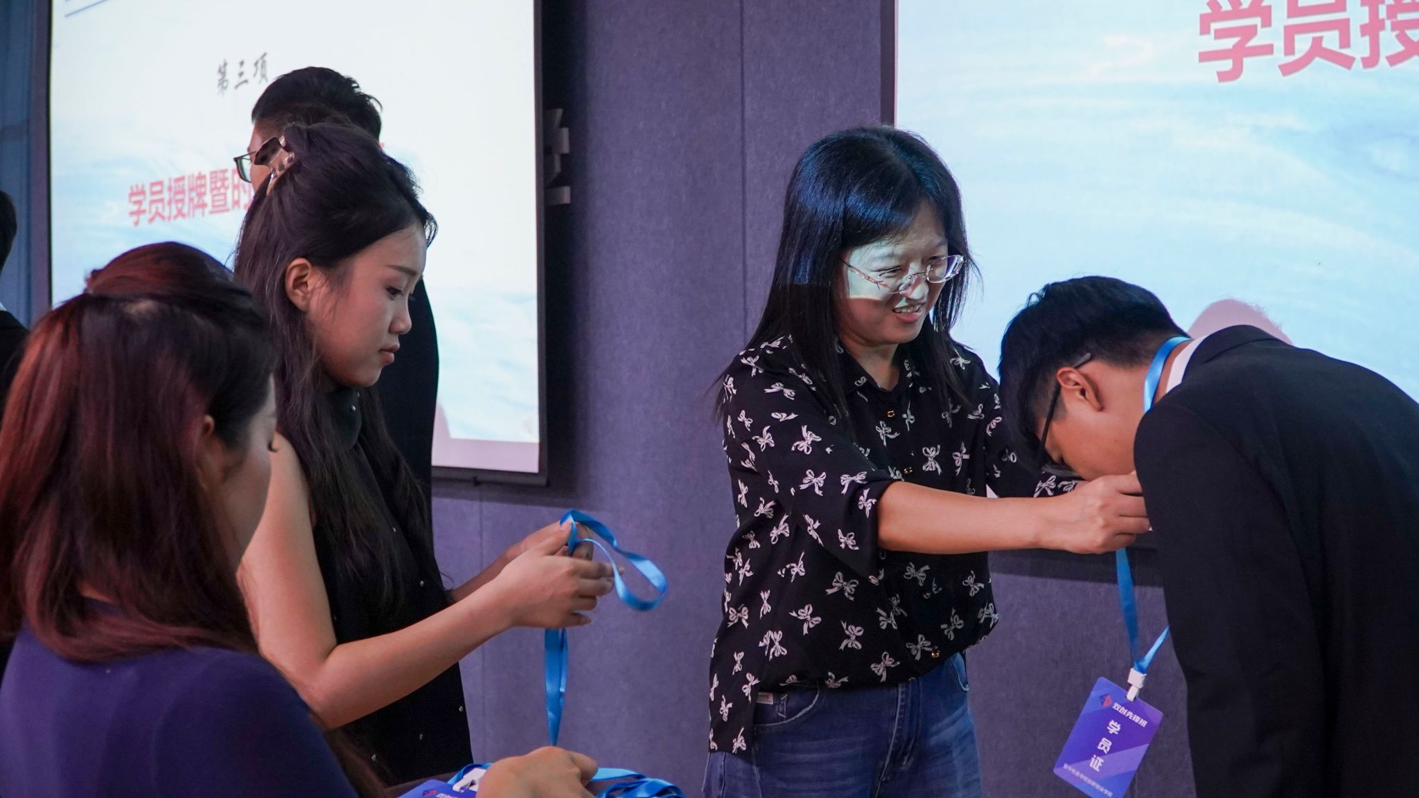 校长助理杨碧霞为学员逐一颁发第五期学员证。当佩戴好学员证,学员们的目光被一旁的“时空信箱”牢牢锁住——箱内铺着泛黄信纸,封口处印着“2025结业启封”的字样。笔尖划过信纸的沙沙声里,檀木香气的信封被郑重投入信箱,成为青春与未来的“双向契约”。