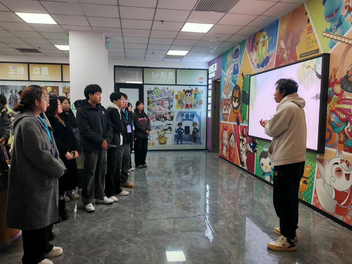 企业走访的第一站是山西传媒学院动漫创作基地。自2013年成立以来,该基地已在动画设计、视觉传达、三维动画制作等领域深耕12载。在这里,学员们领略了杭州亚运会开幕式倒计时宣传片、杨和集团12周年典藏大会舞美视频等重量级项目的幕后魅力。基地详细拆解了工作流程,从前期策划、美术设计,到后期成片制作,特效、三维、音乐等团队如何无缝协作完成精彩绝伦的项目成果,让学员们对传媒行业的运作机制有了直观清晰的认识。同时,基地向学员们抛出橄榄枝,提供实习机会,并邀请大家加入微信群,以便后续交流行业信息与招聘动态。这不仅为学员们搭建了理论与实践的桥梁,还开启了通往传媒行业前沿的视野之窗。