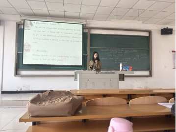 此环节由杨迪老师进行了主题为“Friendship’s Like Buying a House”的示范课展示,主要从四个方面展开“lead-in; global reading; writing techniques; assignment”,结束后由翟平丽老师,裴星星老师,武金红老师针对杨迪老师的课堂设计以及课件制作进行了点评并提出了具有建设性的修改意见。