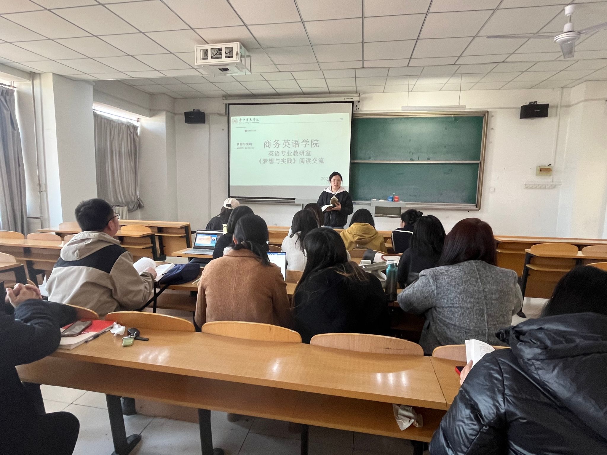 英语专业教研室主任张玉洁老师在开场发言中总体介绍了《梦想与实践》的核心内容。她强调,该书提出的创新教育理念对学校英语专业教学改革具有重要指导意义,希望全体教师认真学习、积极实践,将先进理念转化为教学成果。