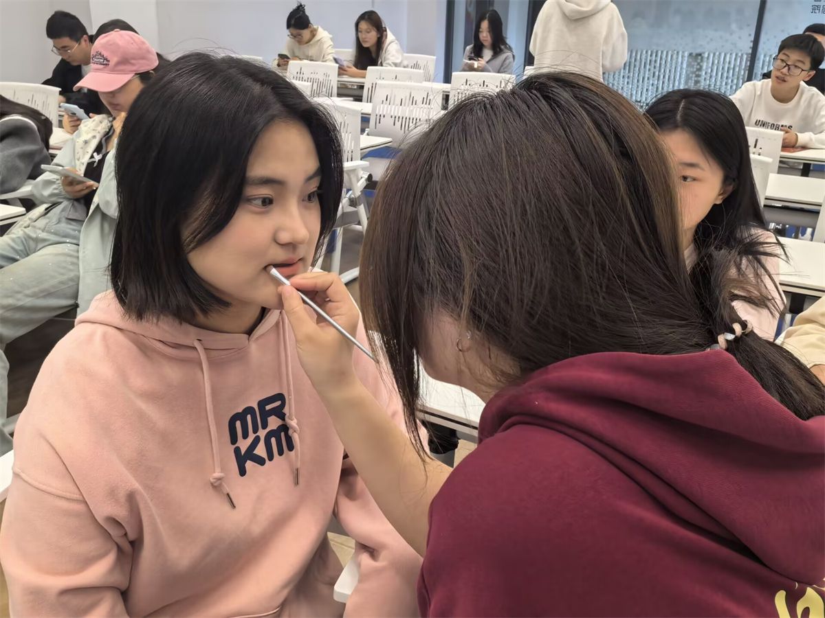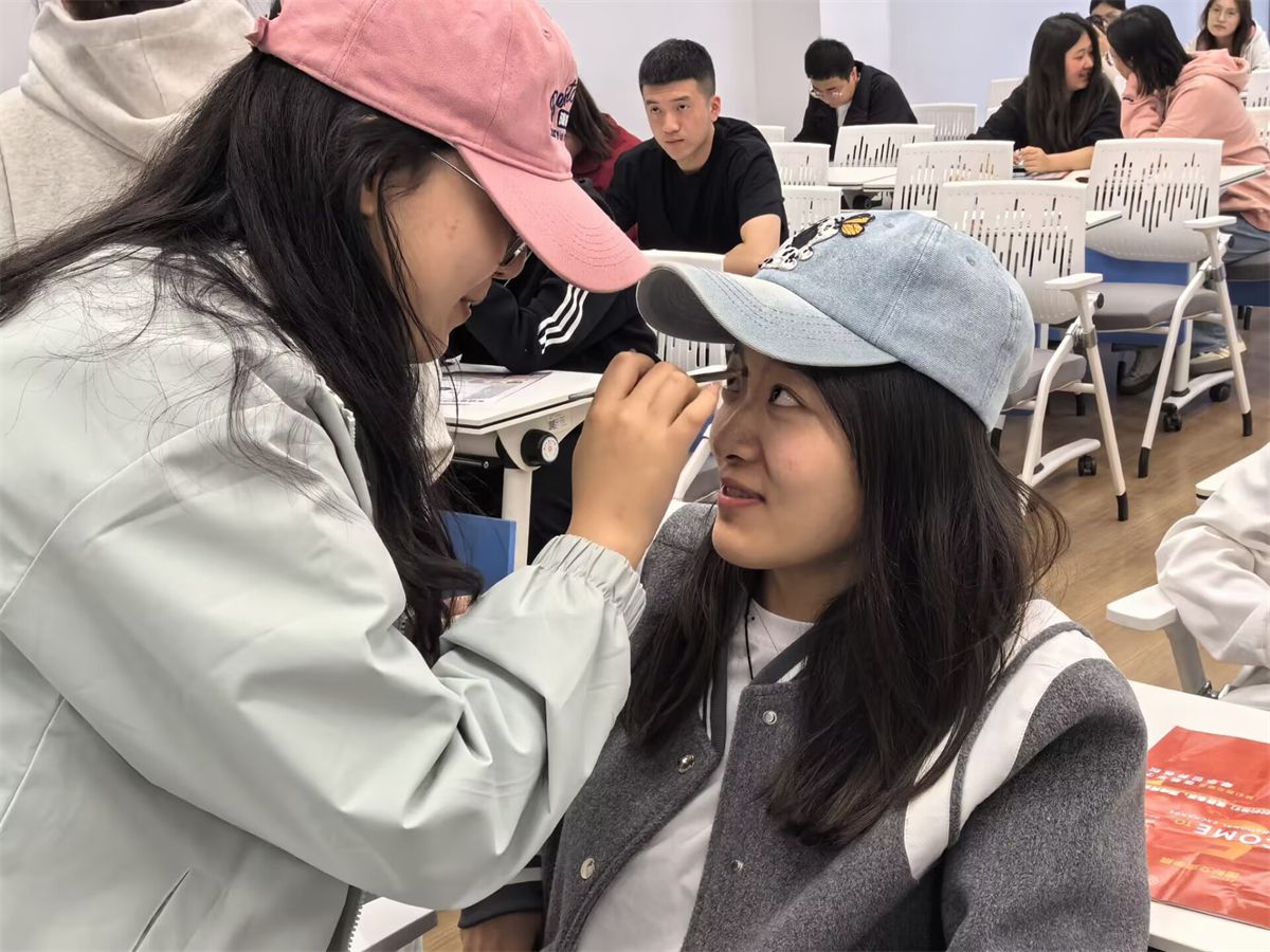老师详细分享了马来西亚妆容特点,从底妆、眉眼妆、唇色、修容等方面进行详细讲解,深入领略马来西亚妆容独特的色彩、图案与艺术风格。在随后的实操环节,同学们在老师指导下分组进行妆容展示,将理论知识转化为实践,丰富了审美体验,培养了审美能力,激发了创造力,得以在实践中融合不同文化元素与现代审美,创作出独具一格的妆容作品。