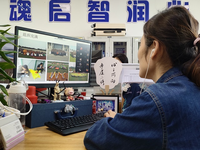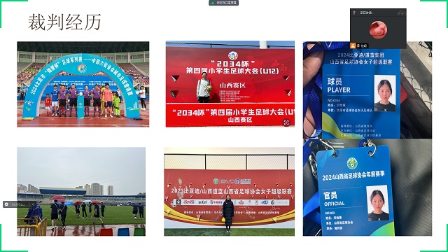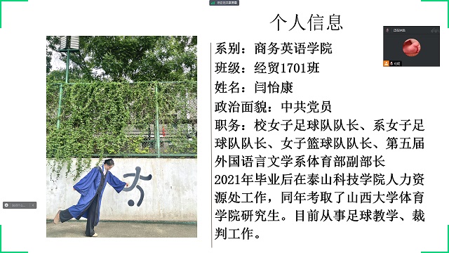 会议开始,伦老师介绍了2021届毕业生闫怡康(经贸英语1701班)同学的完满之路--“汗水助力征途,拼搏点缀未来”,涵盖了丰富的校园生活、跨专业考研的勇敢尝试以及在工作实践中的卓越表现。目前从事足球教学、裁判工作。