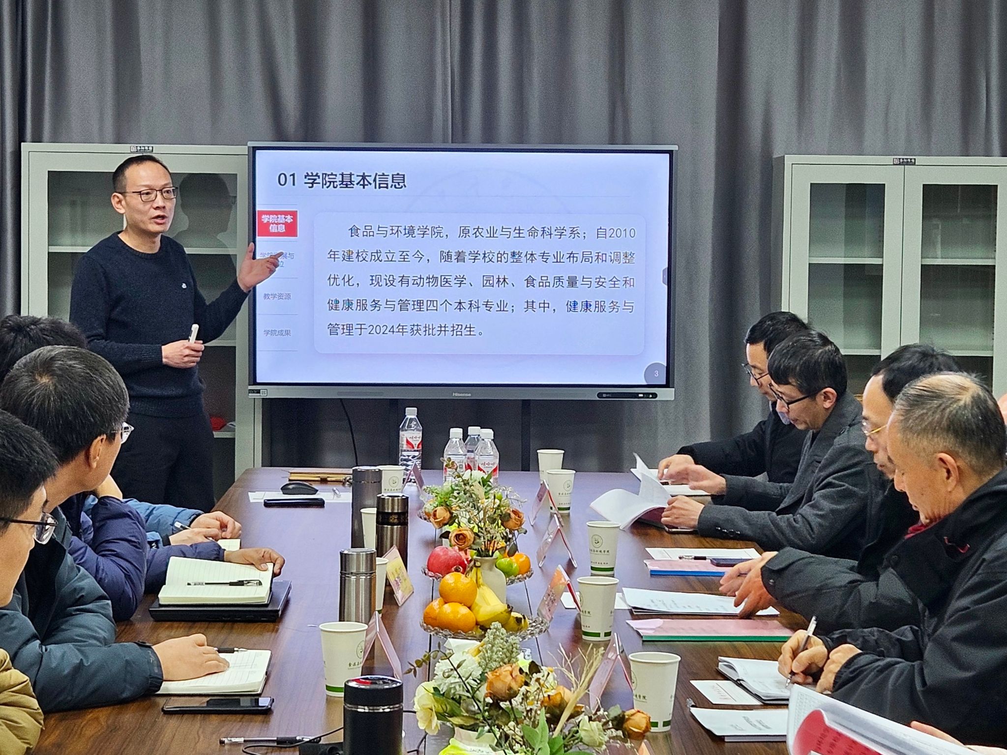 正式的检查工作开始前,张海明院长介绍了食品与环境学院的基本情况。主要从学院的基本情况、学院的发展与定位、教学条件以及学院成果四个方面进行介绍。主要就食品与环境学院的整体专业布局和调整优化,介绍目前学院有在校生的四个本科专业动物医学、园林、食品质量与安全、健康服务与管理。