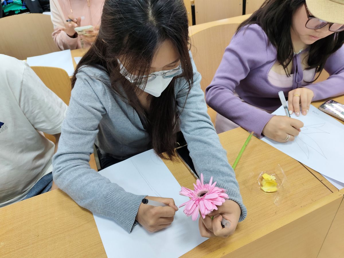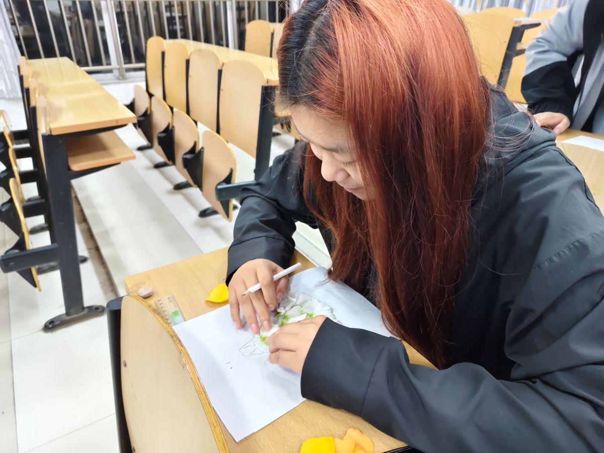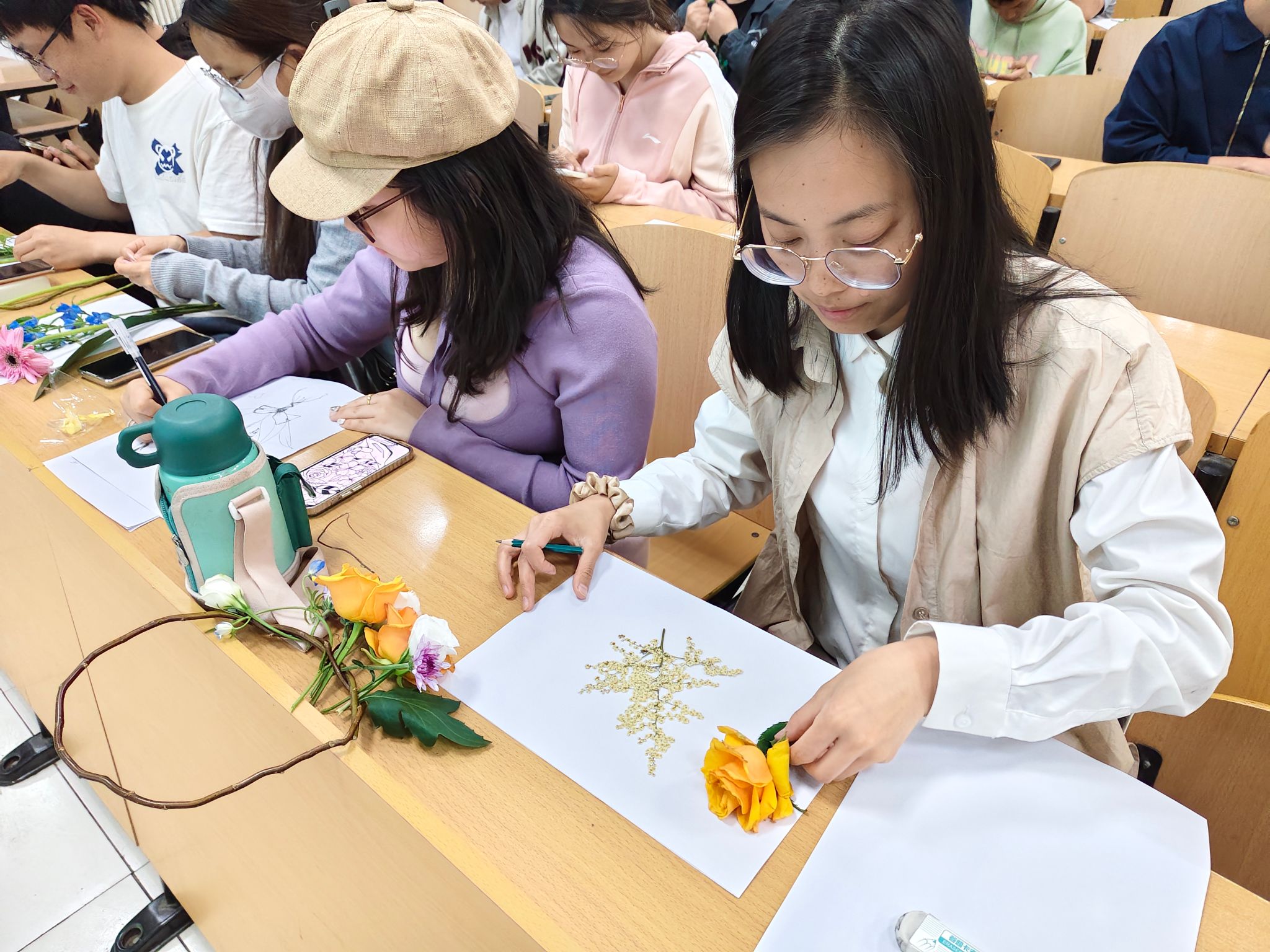 在讲座的最后环节,同学们充分发挥创意,利用手中的植物材料进行创作。收到鲜花的同学,将月季、洋桔梗、小飞燕、龙柳等搭配组合,制作出精致的花环,或是用花瓣拼贴出充满艺术感的图案;持有植物标本的同学,则巧妙构思,将标本与卡纸结合,制作成独特的书签、装饰画。大家专注创作的身影,与手中的植物相映成趣,现场弥漫着浓厚的艺术氛围与自然气息。当一件件作品完成时,同学们互相展示分享,不仅收获了创作的快乐,更在动手实践中进一步深化了对植物疗愈的理解。
