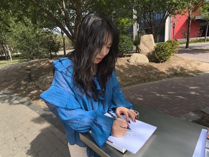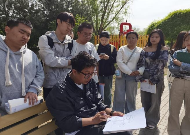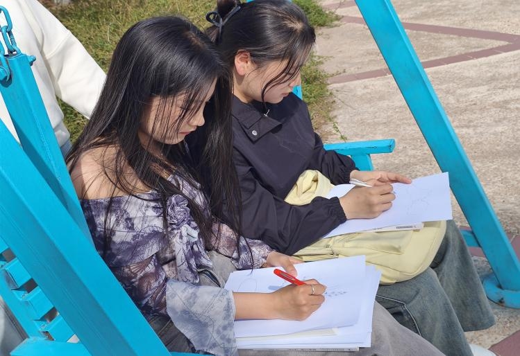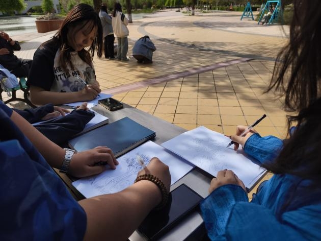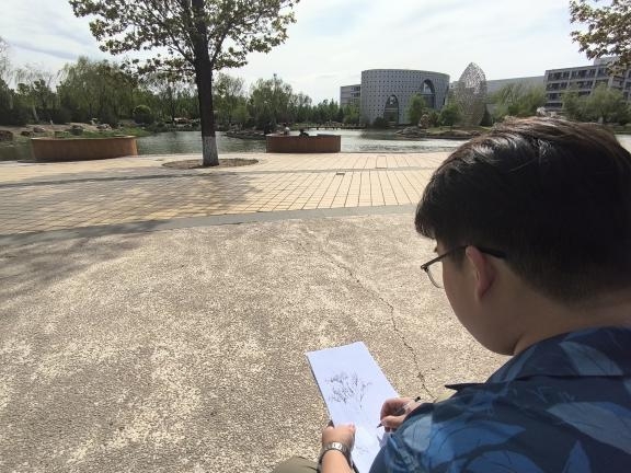 随后,同学们分组前往校园内的特色景观区进行写生。大家以速写的形式,记录下春日校园的盎然生机——有的同学则被那棵造型独特的松树吸引,它的枝干虬曲苍劲,针叶茂密翠绿,展现出一种顽强不屈的生命力;还有的同学将目光投向了岸边那一片婀娜多姿的柳树,柔软的枝条随风舞动,仿佛在跳着优美的舞蹈。王玉虎老师全程指导,针对构图、光影处理等技巧进行个性化点拨,帮助同学们在艺术创作中融入专业视角。
