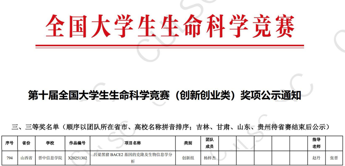 “全国大学生生命科学竞赛”是生命科学类专业的国家级学科竞赛,是本科层次生命科学类专业学生能参与的最高级别学科竞赛,在本次国家级大赛中,山西省获奖学校仅有运城学院(1项)、太原科技大学(1项)、山西农业大学(1项)、山西大学(4项)、晋中信息学院(1项)、中北大学(1项)及忻州师范学院(1项)。