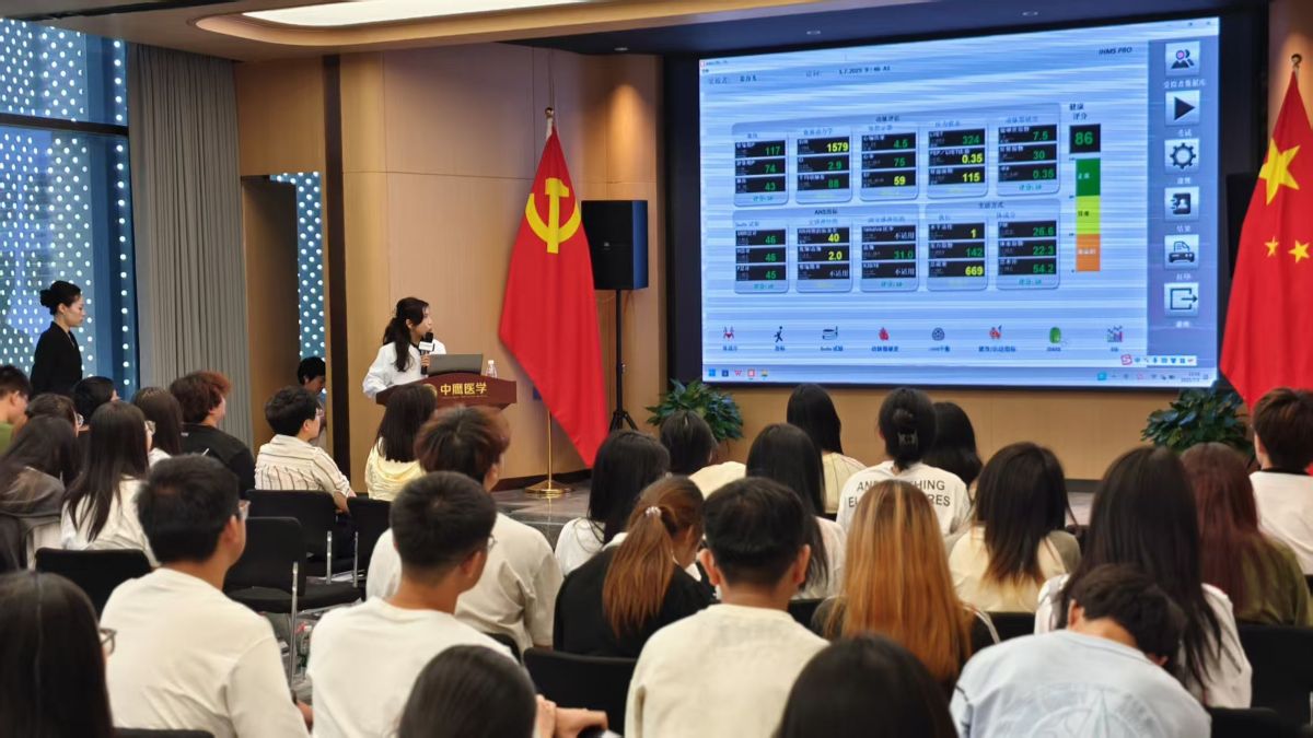 实习期间,在基地专业人员的悉心带领下,学生们开启了一场充实且富有意义的探索之旅。专业人员首先向学生们详细介绍了基地各个功能区域的规划与用途,随后带领学生们近距离观摩了先进仪器如何高效完成身体各项指标检测,学生们对健康体检流程有了清晰认知。同时,专业人员通过对带队老师体验鹰眼健康检测项目结果进行现场解读、演示了如何运用科学手段对亚健康人群进行有效干预,帮助他们恢复健康状态。