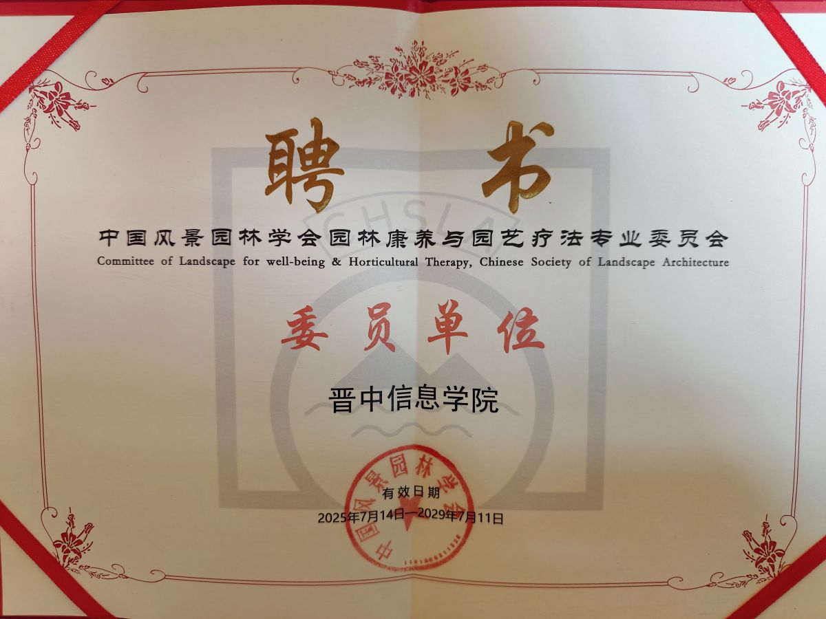 学院选派教师参加本次专业委员会,对于深入了解园林康养与园艺疗法在教育研究、实践应用、推广普及等方面的全面发展具有重要意义。将进一步让更多人受益于自然环境的疗愈力量,为促进大众健康、助力健康中国建设发挥积极作用。晋中信息学院作为委员单位,在未来的工作中积极参与协会活动,将园林康养与园艺疗法融于学院健康类专业发展,明确专业发展定位,构建专业课程群。