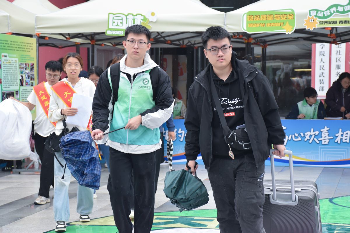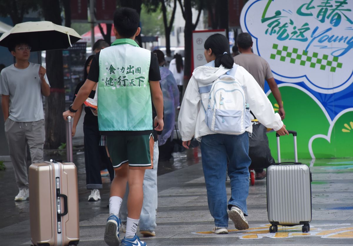 学生服务中心前,人流涌动,身着绿色马甲的志愿者们宛如移动的“暖意坐标”,成为校园里一道亮丽的风景线。经过专业培训的他们,脸上始终洋溢着热情的微笑,这微笑如同冬日里的阳光,驱散了新生初入校园的陌生与不安,成为递给新生的第一张“校园名片”。天公不作美,淅淅沥沥的雨水淋湿了志愿者们的衣角,可他们丝毫没有懈怠,依旧坚守岗位。看到新生提着鼓囊囊的行李箱,志愿者们立刻上前接过,手臂因承重微微绷紧,却始终保持平稳的步伐,将行李安全送到新生手中。报道台后,志愿者们认真查阅每一份新生材料,耐心细致地叮嘱报道流程和注意事项,生怕遗漏任何一个细节。“特派记录官”的快门轻轻按下,将这些带着晨露气息的忙碌身影,永远定格在内存卡中。