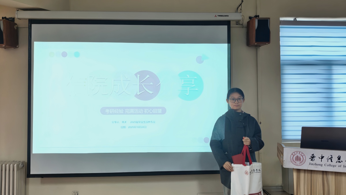 10月24日,信息学院优秀校友、考研成功学子2025届毕业生园林专业常禾应邀重返母校,在箕城书院思辨力大厅开展了一场别开生面的学习经验分享会。分享会现场气氛温馨热烈,常禾同学结合自身奋斗经历,深情回望在校时光,系统分享考研心得,生动诠释了学院“完满教育”理念的育人成效。