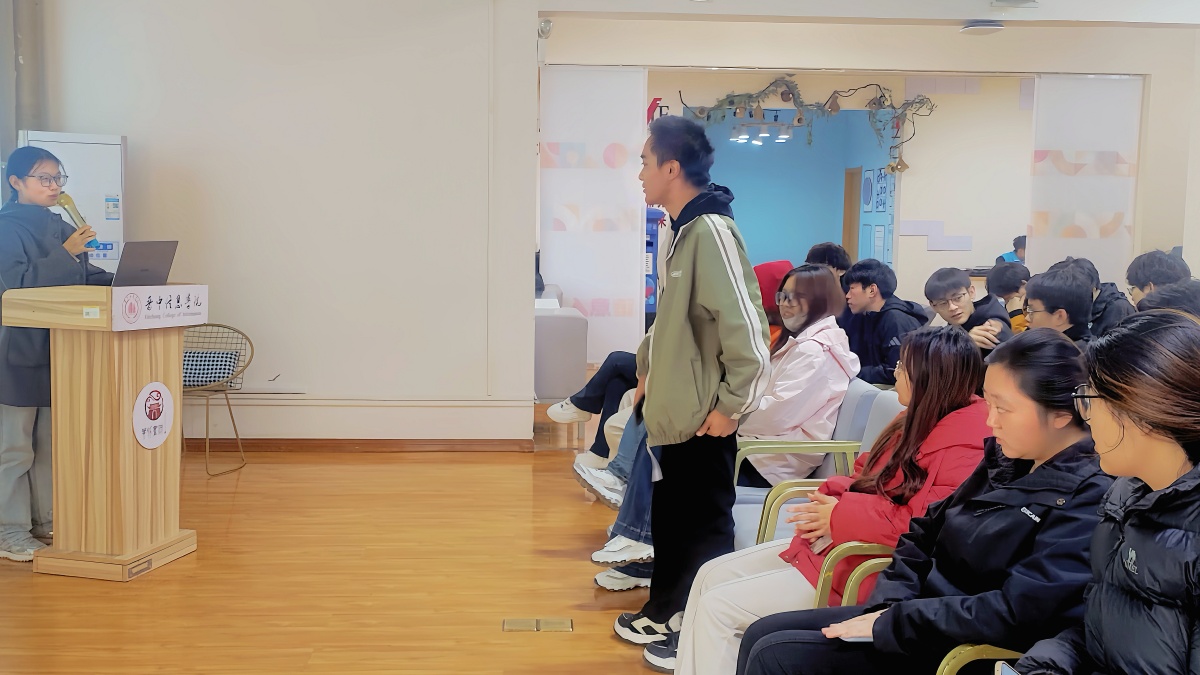 在考研经验分享环节,常禾同学进行了系统而实用的总结。她首先强调“方向选择重于盲目努力”,建议同学们务必结合自身兴趣与学科优势,在专业教师指导下理性规划报考方向。其次,以自身为例,详细介绍了“阶段划分、精细管理、劳逸结合”的复习策略,强调了高效学习的重要性。最后,特别肯定了“朋辈互助”的力量,鼓励同学们积极构建学习支持系统,在合作探讨与相互鼓励中共同进步。