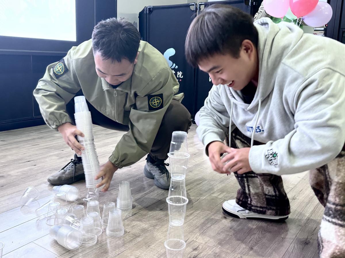 紧接着的“杯子叠叠乐”更是将氛围推向高潮。志愿者们三人一组,屏气凝神盯着指尖的纸杯,既要小心调整角度,又要和搭档默契配合,才能让纸杯稳稳堆叠成塔,30s计时结束后叠出最高纸杯塔的组合能获得可爱发卡。有人手忙脚乱让杯子倒了一地,搭档笑着递上新杯子;有人成功叠起三层,周围立刻响起欢呼——这场看似简单的小游戏,早已超越了娱乐本身。它让大家在全神贯注中,悄然锻炼了团队协作能力;更在潜移默化中传递出深刻的意义:志愿之路,恰似这叠杯的过程。唯有每一步都用心对待,每一人都彼此扶持,才能共同垒起那道守护他人、温暖社会的坚固高墙。