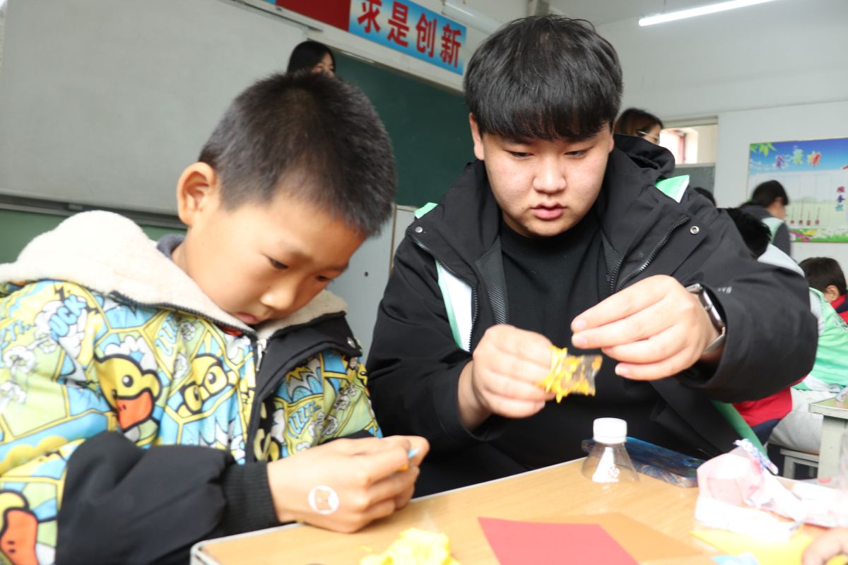 同时,当孩子们在剪裁、粘贴过程中遇到难题时,队员们会轻柔地握住他们的小手,共同完成关键步骤。对于那些拥有独特创意的孩子,队员们则给予充分的肯定和鼓励,让他们勇敢地展现自我。在整个互动中,队员们不仅教授了基础的手工技艺,更通过鼓励的话语和温馨的笑容,为孩子们注入了满满的自信。