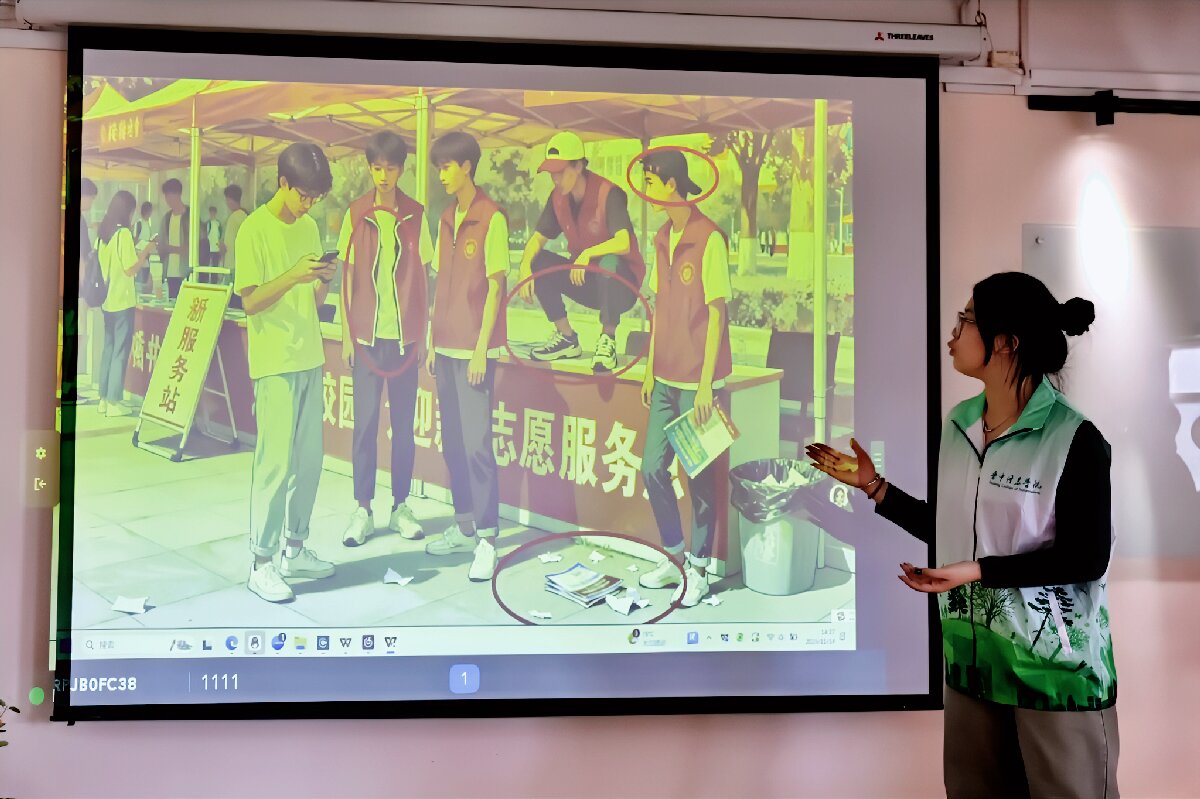 场景找茬大作战环节则考验参赛队伍的观察锐度与问题研判能力,实现“速度与精度”的赛事节奏巧妙切换。聚焦乡村建设规范、健康服务标准、志愿服务细节三大专业维度,以三组实景化主题图片构建沉浸式“问题侦查场”。各团队需在每组图片3分钟的限时内找出不合理之处,每成功找出1处得5分。参赛队员们聚精会神观察图片细节,相互提醒、共同研判,从乡村基础设施布局到健康行为规范,不放过任何一个细节漏洞,在找错过程中进一步明晰了乡村合理发展模式与科学健康生活的核心要点,既明晰了乡村规划“守红线、显特色”的核心原则,又夯实了科学健康生活的实操要点,完美践行“在找茬中求知、在思考中提升”的活动初衷。