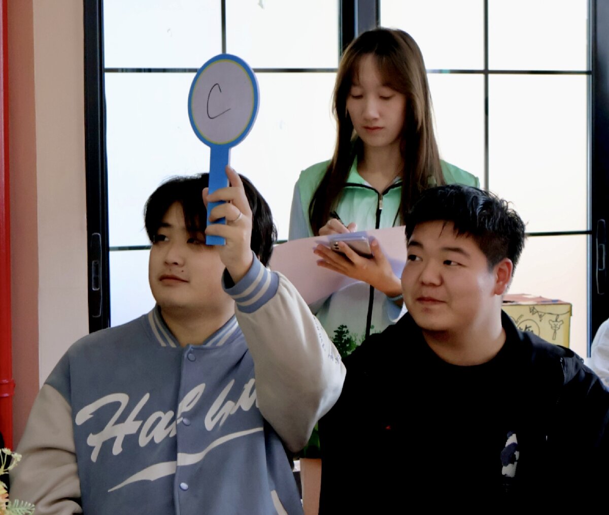 答题过程中,各团队成员在规定时间内充分讨论、分工协作,快速梳理知识点、敲定答案并书写在白板上展示。各团队限时讨论、分工协作答题,其中一组表现亮眼:队长统筹节奏,队员分攻政策解读与产业核对,当遇到“乡村旅游产业融合发展模式”这一模糊知识点时,五人迅速围拢展开热烈探讨,在短时间内形成统一思路并敲定答案。整个过程中,他们高效的分工、精准的知识调用与流畅的协作配合,充分展现了扎实的乡村振兴专业知识储备与良好的团队协作精神。