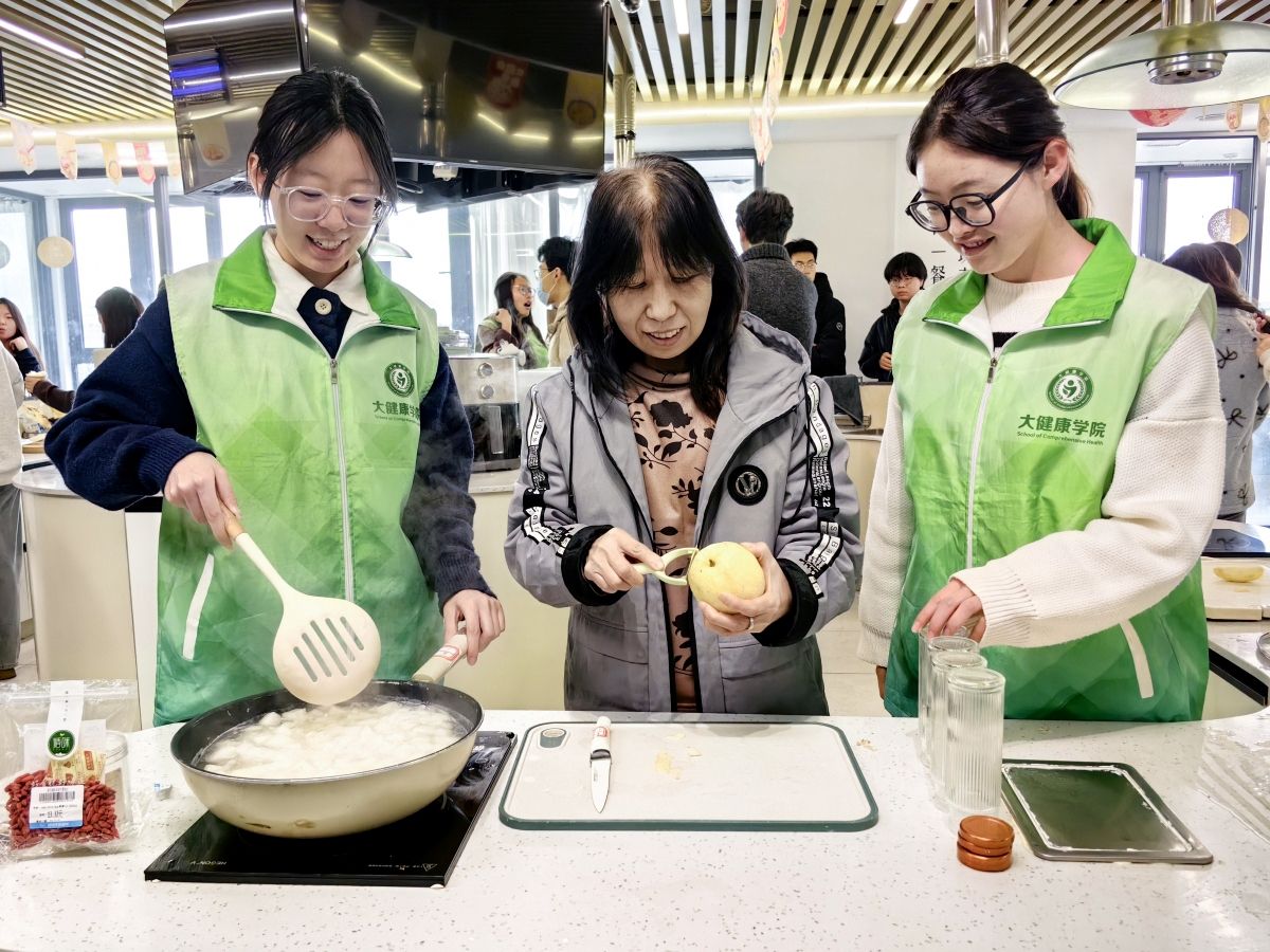 从“秋冬干燥需润肺补气,梨与红枣是王炸组合”的食材搭配,到“食材清洗要较真,火候把控藏营养”的食安要点,再到“早眠晚起养阳气”的作息建议,专业知识被融入趣味科普,互动氛围热烈。同学们演示红枣去核、银耳泡发等操作要领,耐心讲解“桂圆久煮易失清甜”等门道;阿姨们化身认真“学徒”,俯身观察、模仿操作,现场满是指尖相授的专注与真诚。经过精心炖煮,琥珀色的桂圆红枣茶与胶质满满的银耳雪梨羹新鲜出炉,阿姨们将第一碗甜汤递到同学们手中,温热甜汤交织着醇厚甘润与清润回甘,暖透冬日寒凉。