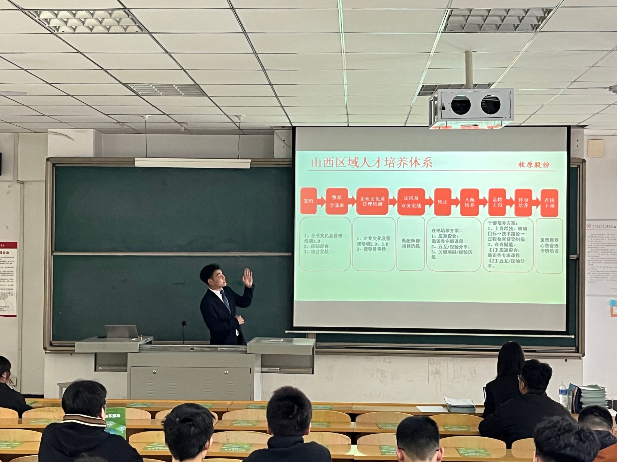 牧原食品股份有限公司人事张雷涛为同学们详细讲解了牧原的企业文化、发展历程、培养育人计划、晋升机会等。本次招聘提供五个热招岗位,包括养殖生产储备干部、兽医师,生鲜客户经理、市场管理岗、环保管理岗、机械工程师(饲料设备方向),涵盖专业广,人才需求量大。他表明,牧原非常重视员工的培训和培养计划,会给到员工向上发展的机会,给员工制定培养计划和晋升渠道,并强调大企业对人未来发展的重要性,让同学们深入地了解牧原公司的发展前景及在校招聘实习岗位,鼓励大家紧跟行业新业态、开阔新视野,为就业和实习做准备。