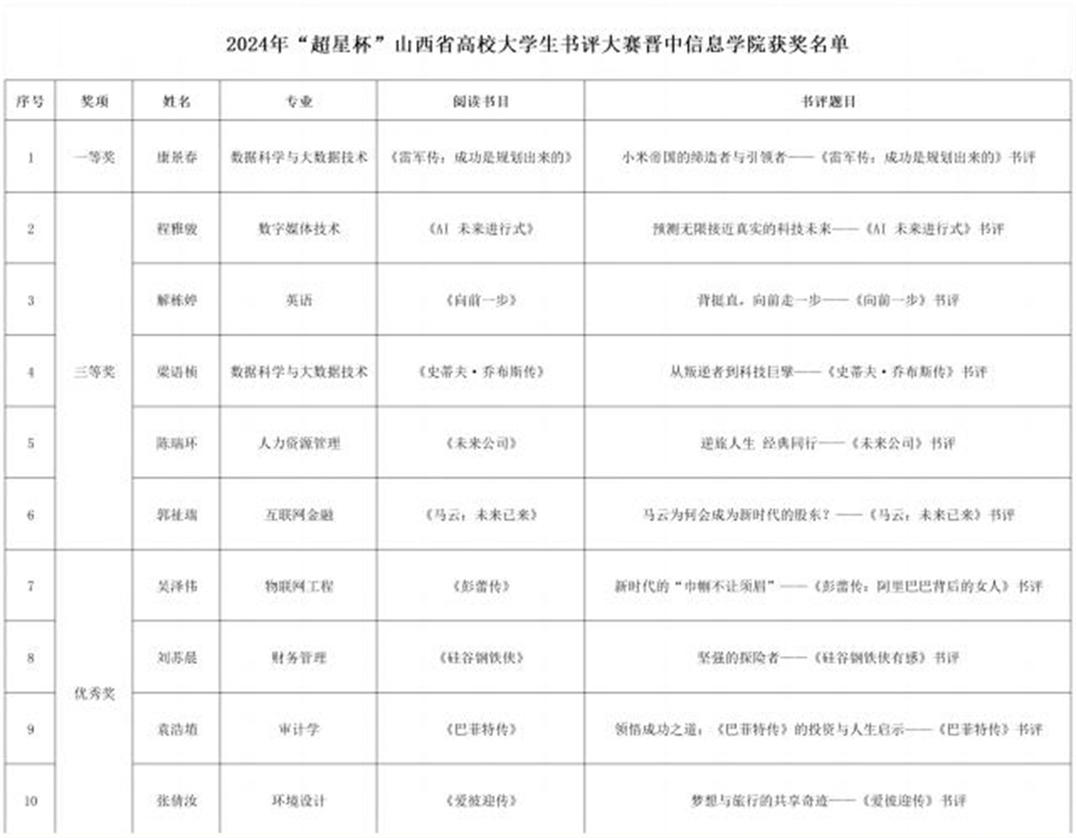 自今年3月山西省高校大学生书评大赛通知发布以来,“信息产业大咖传记阅读计划”综合办公室依托我校“信息产业大咖传记阅读计划”,积极组织全校学生参与投稿参赛,累计收到投稿125份,经过严格初筛后,由我校创意写作学院、“阅读计划”综合办公室老师对98份书评作品进行评分并推荐至大赛平台,最终10份书评作品荣获省级奖项。
