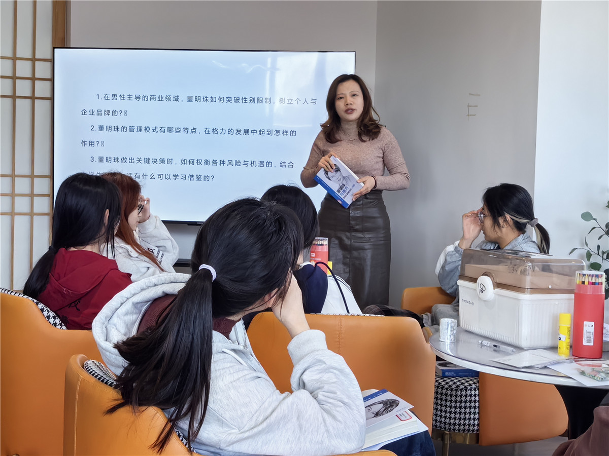 提出“雄性竞争”并非性别标签,而是充满在逆境中破局勇气象征的董明珠,是企业领导者中的“破圈派”。三达书院、太行书院联动全生异科导师,以媒体评价引入,描绘了董明珠追求卓越、敢于创新的企业家形象;艺术传媒学院围绕《董明珠传》展开讨论,同学们在感悟与摘录中分享了女性在成长过程中应如何保持独立、追求梦想、塑造强大内心的宝贵经验;杏花书院名誉院长高昂老师与45位学生共读《董明珠与格力》结合自身“无手机阅读”习惯与艾宾浩斯笔记法,强调在速朽时代搭建知识锚点的重要性;食品与环境学院、远景学院通过导师领读,分享触动自己的女性力量故事篇章,结合时事热点,带给同学们更深层次的思考,激发同学们的阅读兴趣。