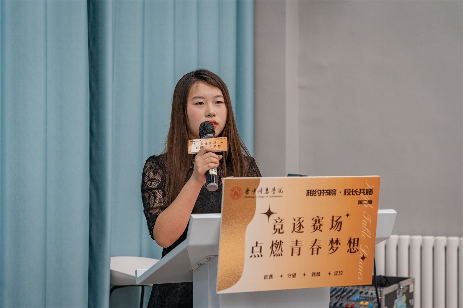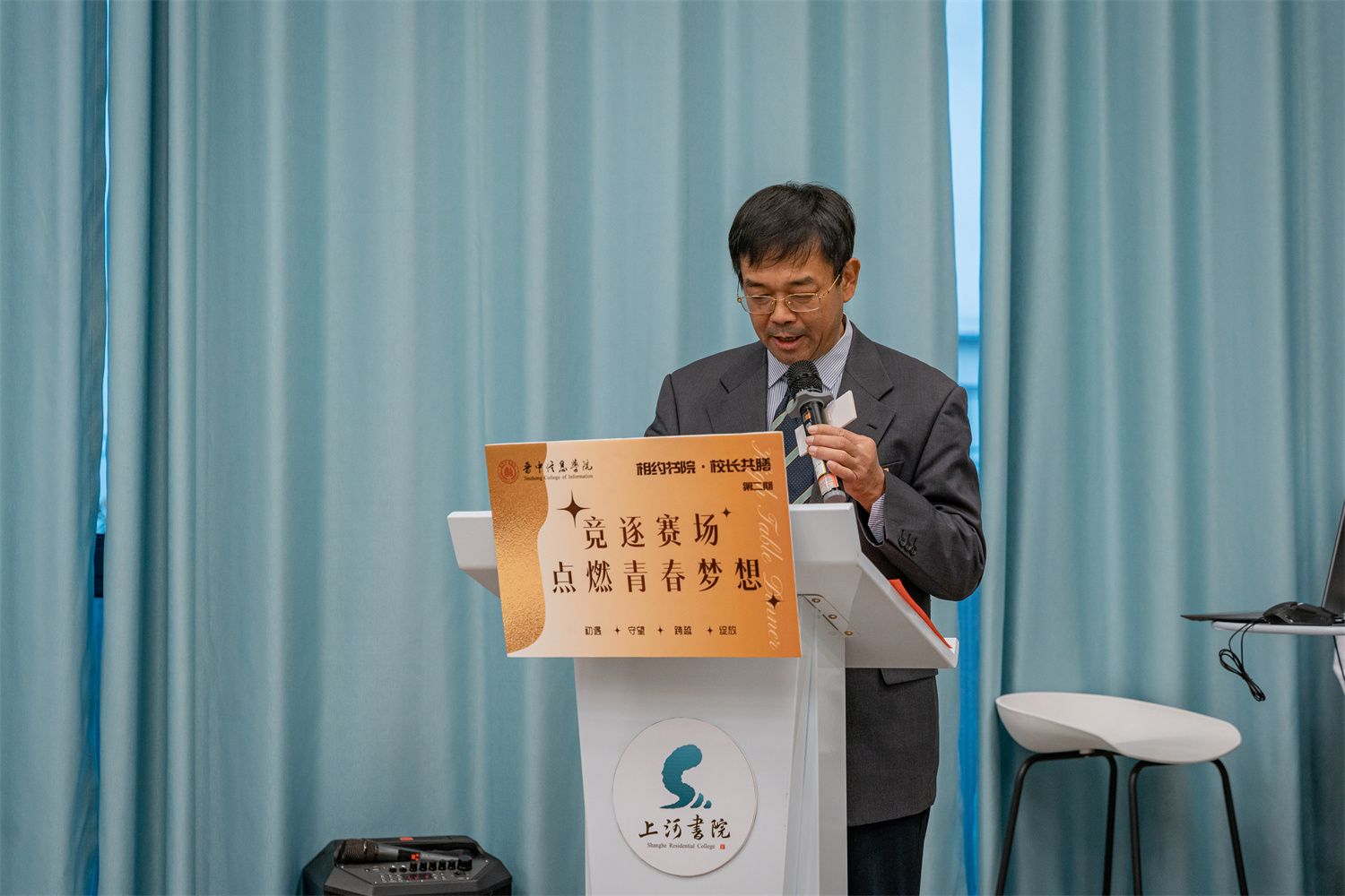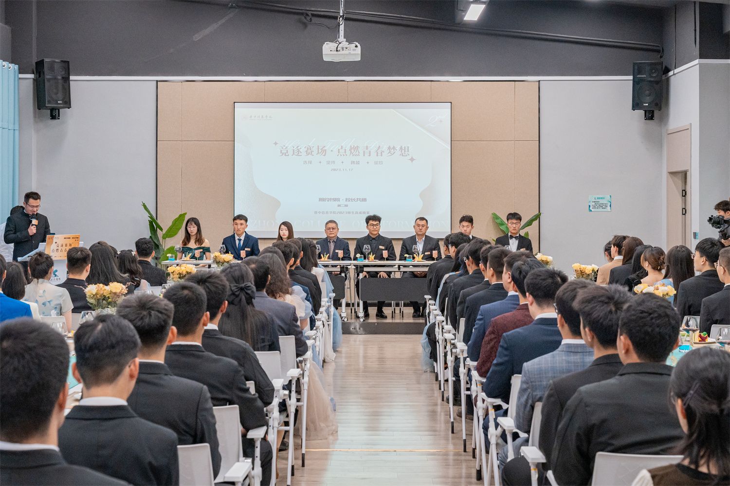 11月17日17:00,由书院部主办,太行书院承办的“相约书院 校长共膳”第二期高桌晚宴在上河书院拉开帷幕。百余名师生齐聚乌马河畔,围绕“选择· 坚持·跨越·绽放”共话与阿信共赴竞技体育完满赛场的成长故事。大家相聚于此,共膳共思。身着正装,围坐在宽敞明亮、高桌整齐的书院中,品着精致的美食和飘香的红酒,彼此分享成长、分享生活、分享观点、分享思想。