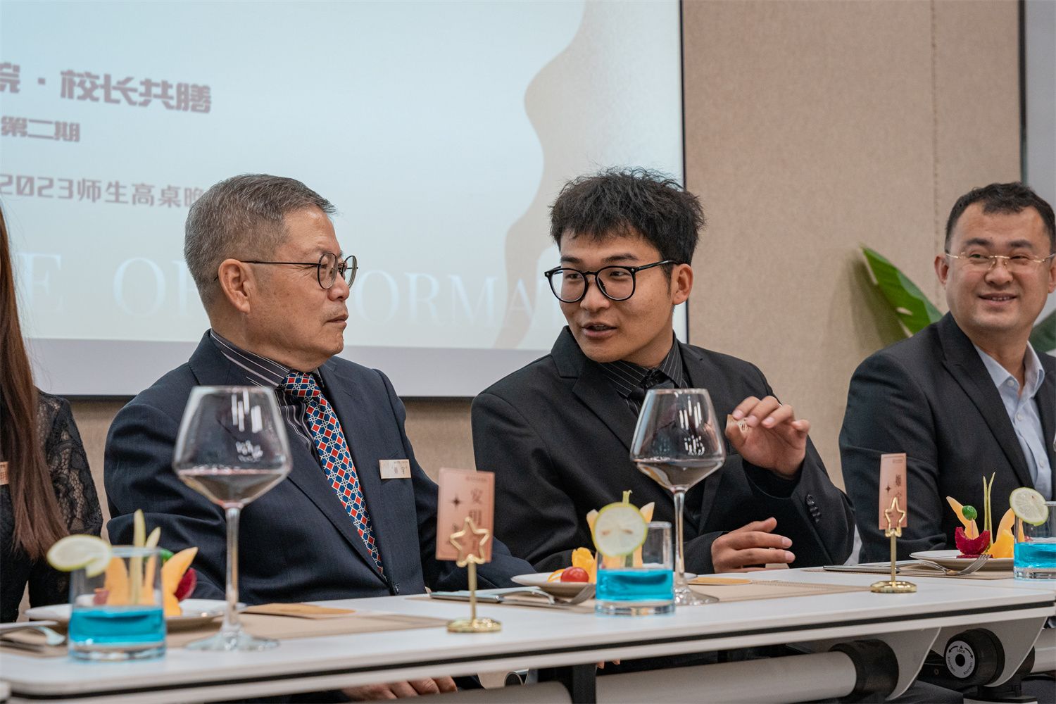 晚宴上老师们散发着睿智、典雅、温润的气质,同学们洋溢着青春、蓬勃、热烈的气息,为这个寒风凛冽的初冬带来阵阵暖意,为万木凋零的乌马河畔带来片片生机。大家共同述说着自己的故事,分享阿信完满赛场给予彼此的未来力量。期待下一期“相约书院 校长共膳”的到来。