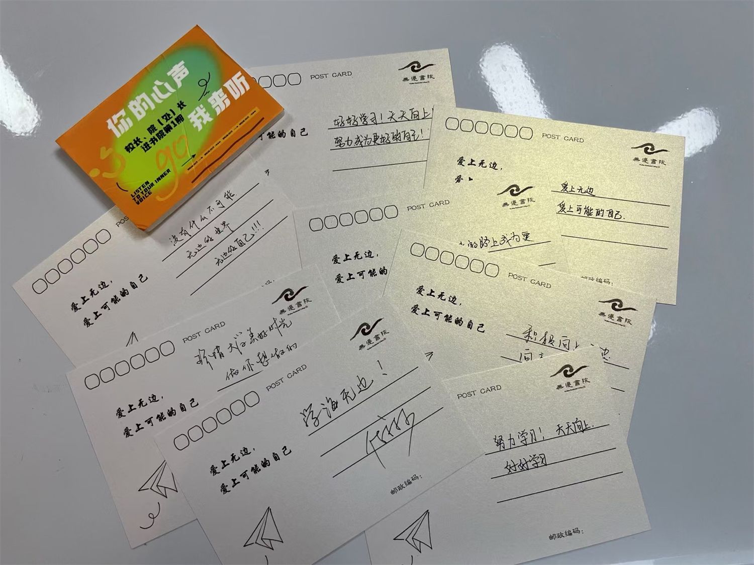 总有些问题难以解决,总有些困惑无法诉说,总有些建议想要表达,对于因羞涩与忐忑而无法举手提问的同学,无边书院精心策划了一个特别的“寄语书写”环节,为在场的嘉宾与同学提供了一个抒发内心情感的独特平台。近七十名师生纷纷提笔,在一张张精美的卡片上倾注自己的心声与对未来的美好憧憬。有的卡片上,流淌着对书院、对学校的深情厚谊与感激之情,字里行间洋溢着温暖与归属感;有的则承载着个人的奋斗誓言与人生理想,展现出青春的激情与不屈的斗志;也有的同学就学校的基础设施、后勤保障等大胆建议、勇敢吐槽。