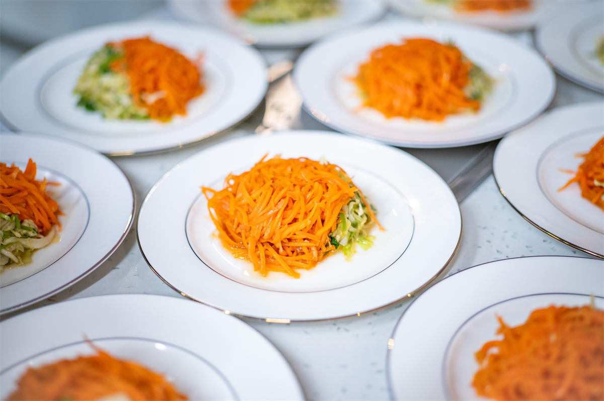 在温馨愉悦的氛围中,一道道精心准备的美食依次被着装整齐的“学生助理”送上餐桌。第一道美食是“清欢雅味碟”,这道菜由胡萝卜和茴子白两道小菜组成,寓意着在简单的小菜中能品味到生活的本真乐趣。