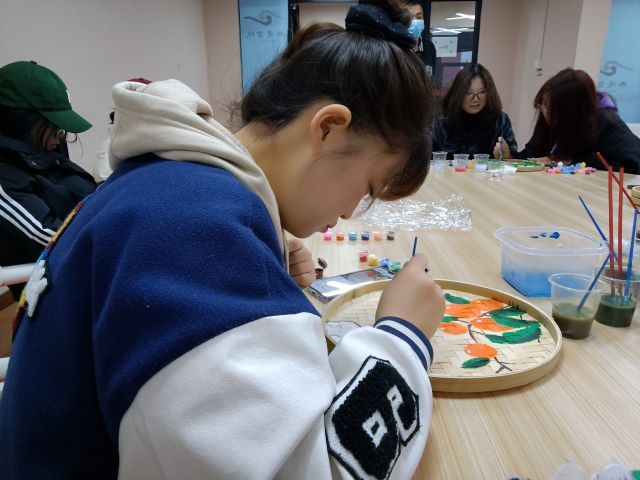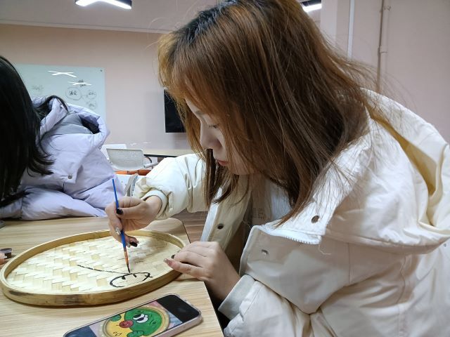 活动伊始,同学们首先了解到了簸箕画的历程,早期的簸箕画以抽象的牛、鱼和神话故事、风土民情等为题材,用比较粗犷和夸张的手法,生动地体现了日常生活场景。风格古朴平实。随着时代的发展和变迁,簸箕画的绘画题材和手法在传承的基础上,增添了更多新的元素;构图自由奔放,想象大胆丰富,使原本很平凡的很普通的簸箕,在漫长的岁月里,经过历史的沉淀,形成了独具特色的民间文化艺术,演变成一个个古朴典雅、别具一格的艺术品。