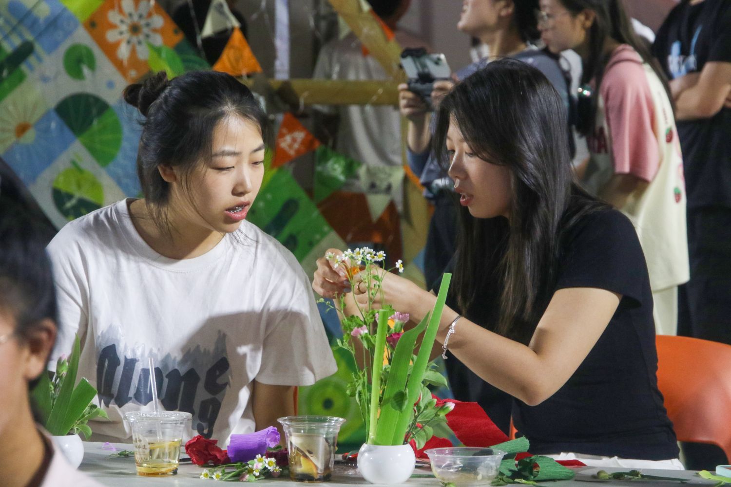 一花、一叶、一瓶,交织出插花艺术的独特魅力。太原市插花技艺非遗传承人、晋源区非遗分会副会长高俊芳老师,为信院师生带来一场中式美学盛宴。她深情地讲述着非遗插花的历史与家文化的交融,让我们明白,插花不仅是一种艺术,更是一种生活态度与情感表达。正如高老师所言,“插花艺术不仅美化了我们的居住环境,更是一种生活态度的体现,它教会我们如何与自然和谐共处,如何在平凡中发现美。”生活如花,美丽需要我们去发现、去创造。在高老师的指导下,师生们亲手尝试,用花朵和绿叶创造属于自己的浪漫。各式不同的作品在观众们热烈的交谈中出炉,或旁逸斜枝,或婀娜多姿,或典雅端庄,或别致精巧。每一个作品都展现了插花艺术的独特魅力和无尽创意。