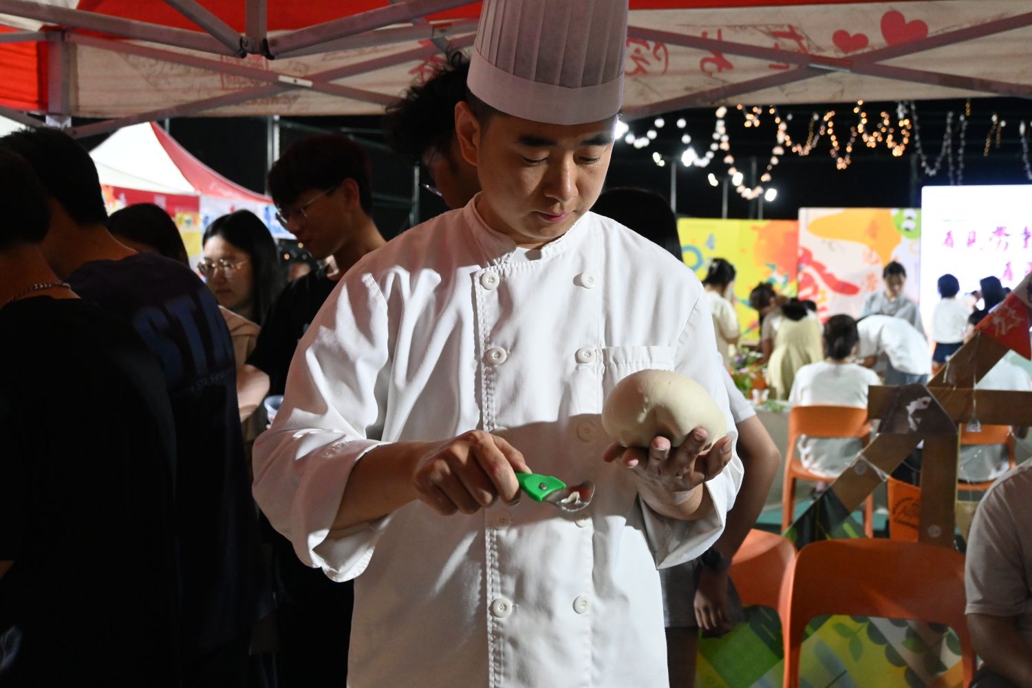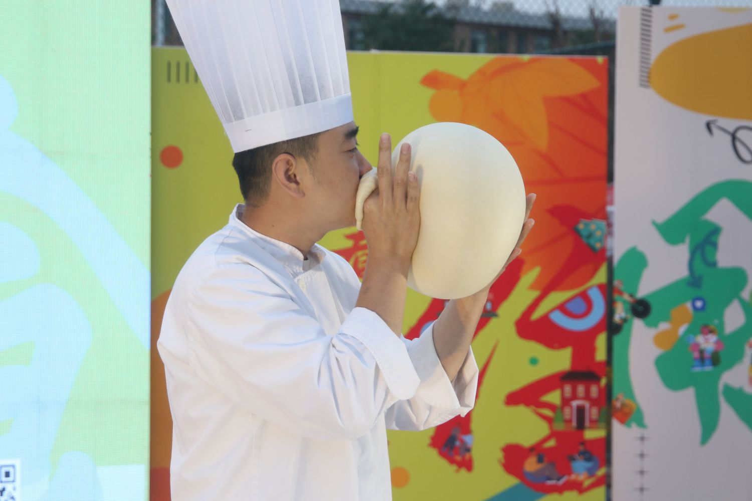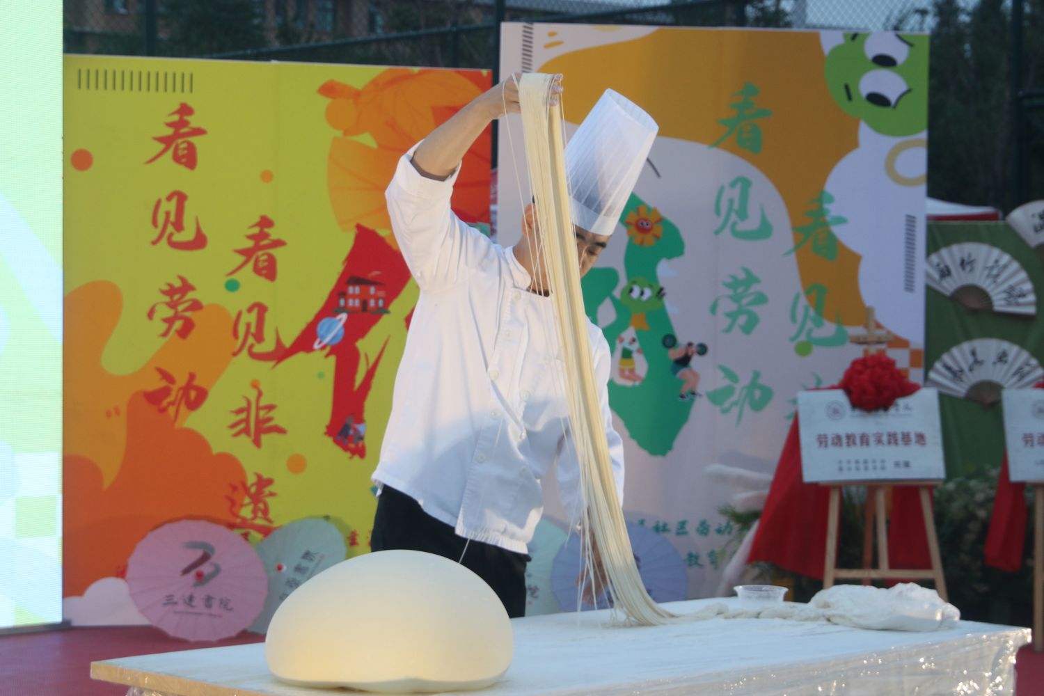 “世界面食在中国,中国面食在山西。”这句脍炙人口的俗语,无疑是对山西面食的最高赞誉。每当提起山西面食,人们总会想起那些描绘面条舞动、面点翻飞的生动画面,以及那些深入人心的俗语。曾凭借《剔尖打靶》打破吉尼斯纪录的刘新瑞师傅为我们带来了一场拉面绝活表演。揉面、饧面、溜面、拉面,每一步都精准而流畅,面团在刘师傅手中化为细长面条,如同银鱼翻浪,令人赞叹不已。他将面团吹成圆鼓鼓的面球,面皮薄而不破,技艺高超,令人叹为观止。而在与现场观众互动的过程中,刘师傅拉出的拉面细如毛发,遇火可着,技艺高超,引得满堂喝彩。