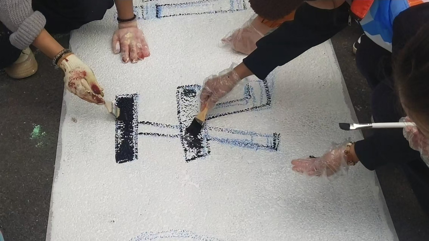 在等待底漆干燥的间隙,赵同学将参与者分为构图与上色两大团队,激发了团队的创意碰撞。构图团队围坐一堂,激烈讨论,力求在画布上勾勒出最富创意的画面布局;上色团队则沉浸在色彩的海洋中,探索最佳色彩搭配,每一笔都蕴含着对美的追求与探索。随着底漆的干燥,绘画组迅速行动,细致划分区域,赵同学亲自带领团队,以彩色粉笔精心勾勒书院吉祥物“边小葵”,将书院文化与青年创意完美融合,为观众带来了视觉享受。