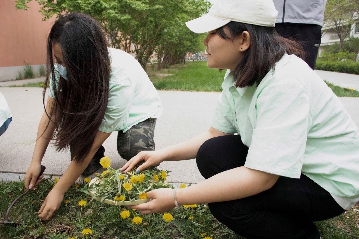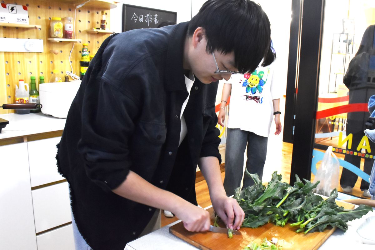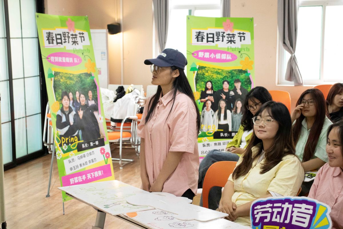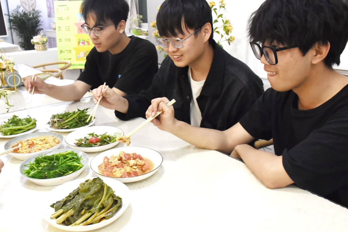 4月21日,无边厨房首次亮相,化身“野菜灵感实验室”。同学们将麦蒿、蒲公英、苦菜、车前草……这些绿意盎然的战利品变成了一道道美味佳肴:“绿野清欢”凉拌车前草,脆嫩叶片裹上蒜香醋汁,一口咬下,仿佛嚼碎了整片草甸的春光;“金穗迎春”麦蒿炒蛋,金黄与翠绿碰撞,锅气升腾中溢出田野的蓬勃生机。更有小组脑洞大开,将蒲公英根焙炒成茶,取名“大地回甘”,轻抿一口,苦涩后泛起的清甜恰似劳动的余韵。同学们围坐分食,筷子与笑声交错,有人咂嘴回味:“原来野菜的‘野’,是自由生长的浪漫!”